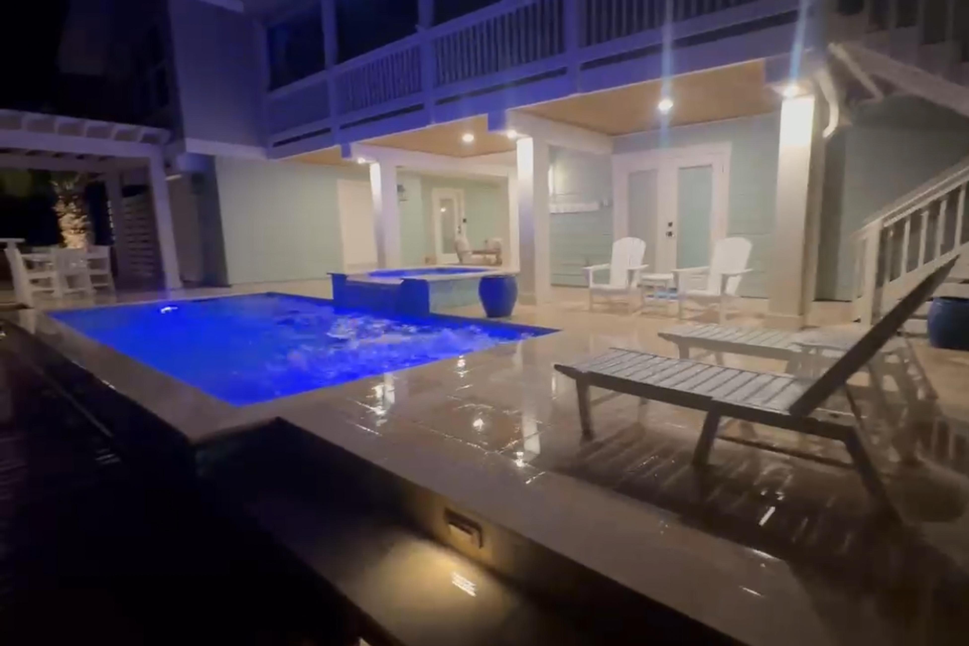 For ultimate relaxation, unwind in the luxurious hot tub, which cascades into the sparkling pool. A tropical cabana with a full bar and comfortable seating offers the ideal spot for evening cocktails, friendly games of Jenga, or outdoor movie nights on the TV. Two additional balconies provide even more space to take in the views and soak up the sun.