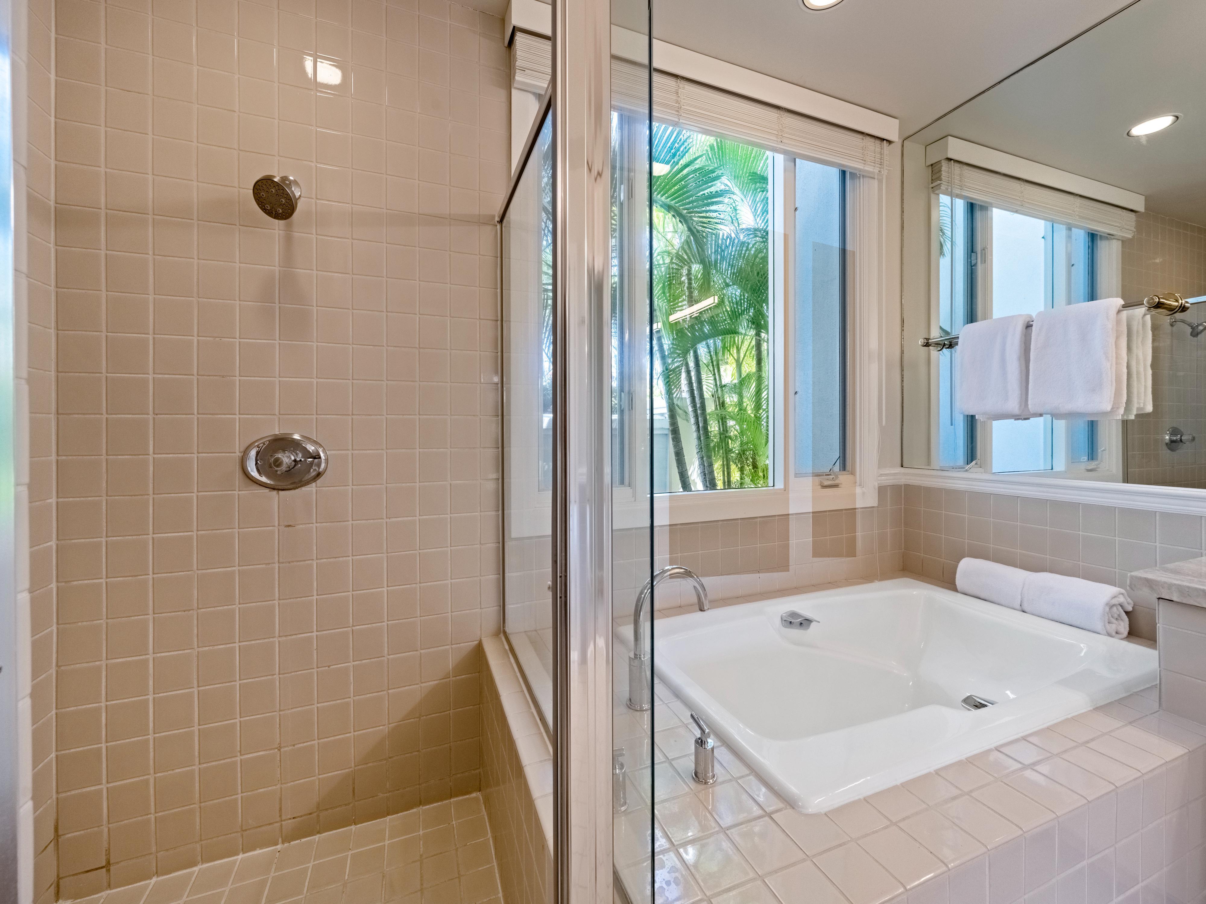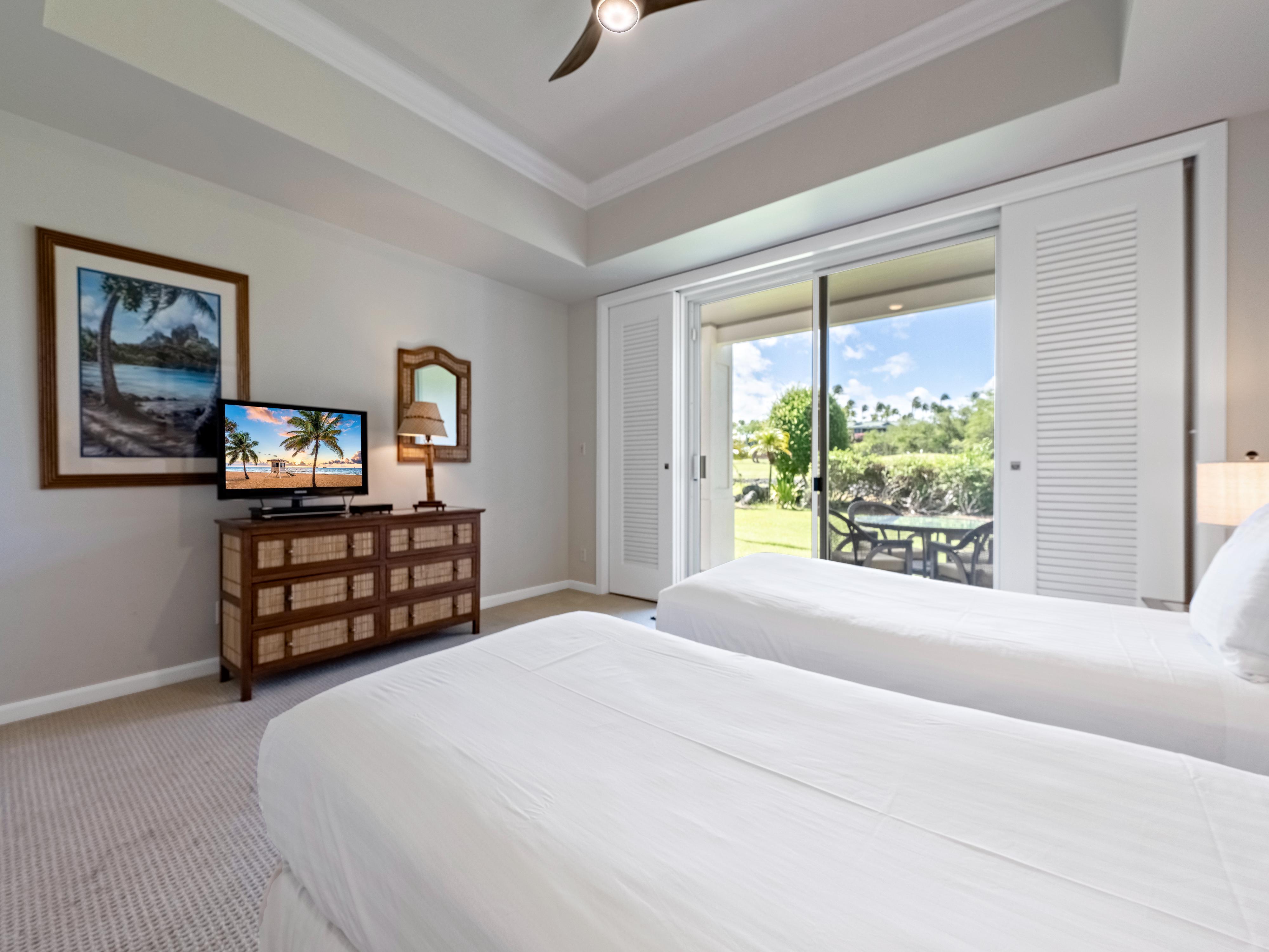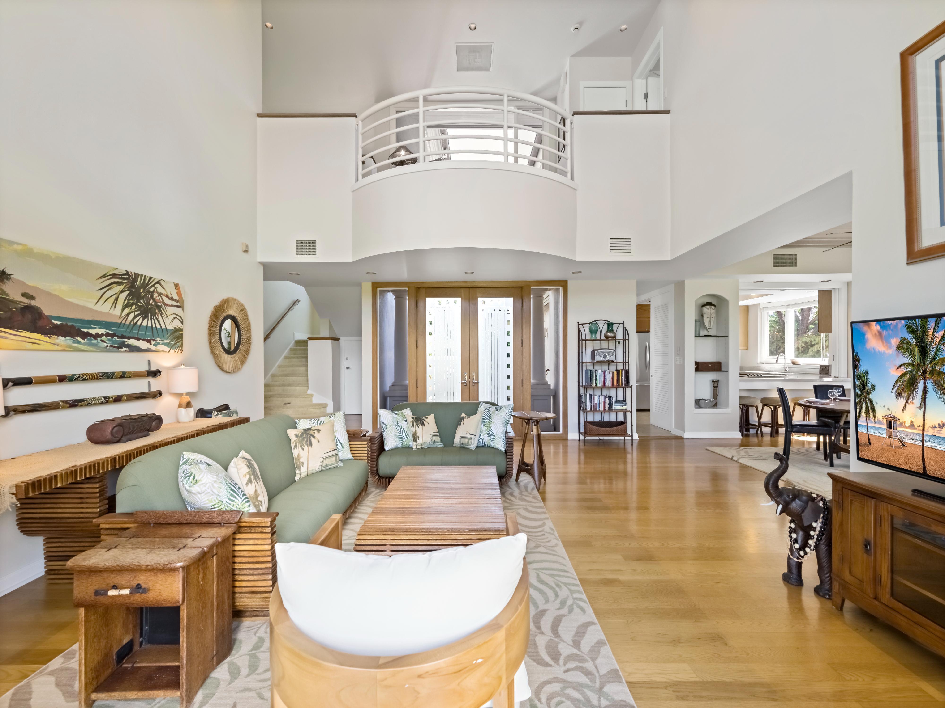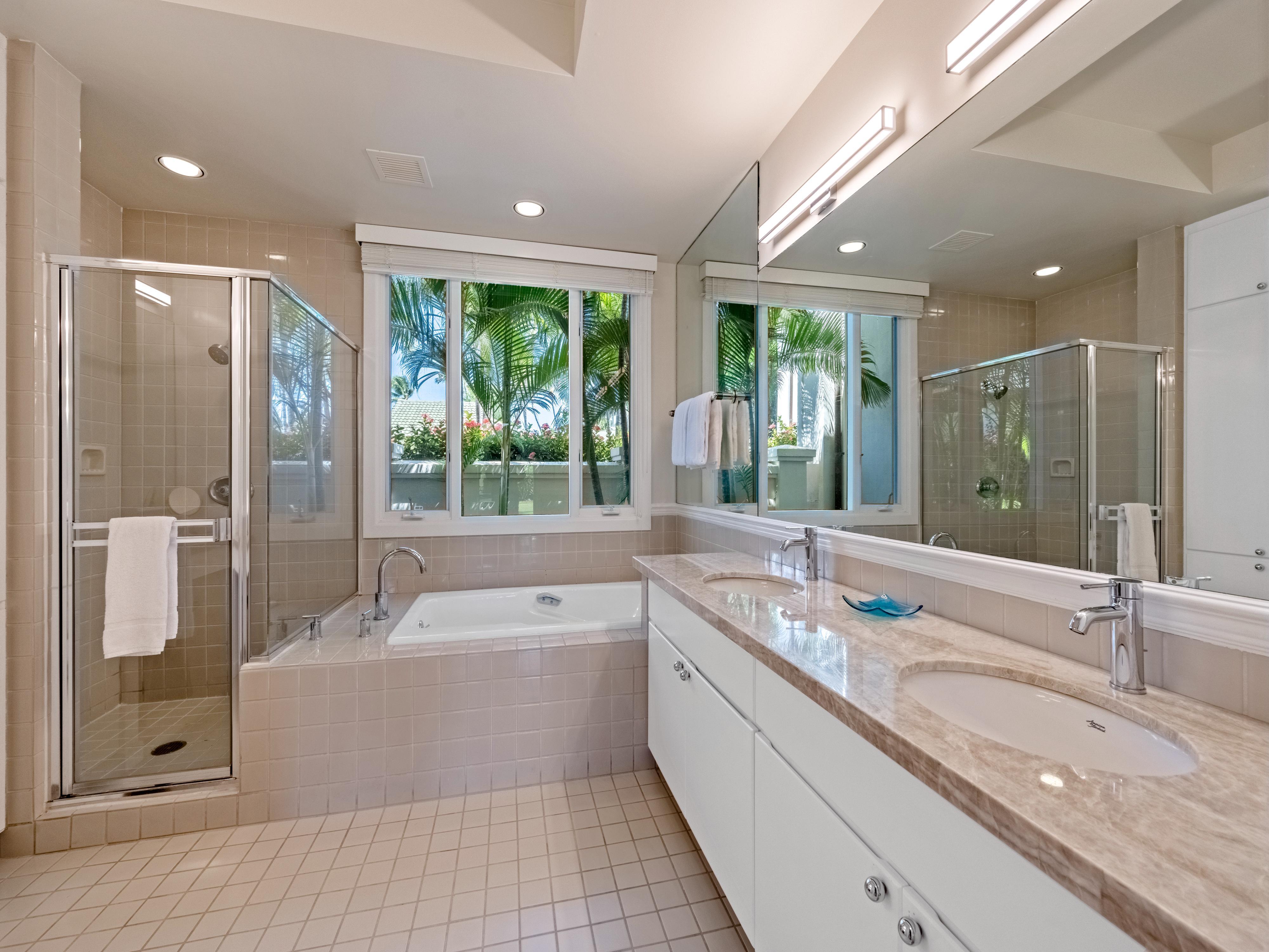 Each of the three bedrooms in this townhouse feature a private en-suite bathroom with full soaking tubs and detached shower. The two upstairs bedroom suites include king beds and private outdoor lanais with elevated views of the surrounding tropical grounds. The ground floor bedroom includes two comfortable twin beds (that can be transformed into a king if requested) as well as an en-suite bathroom with dual vanity, soaking tub, and detached shower. Comfortably sleep up to eight guests with a day bed located in the loft area upstairs.