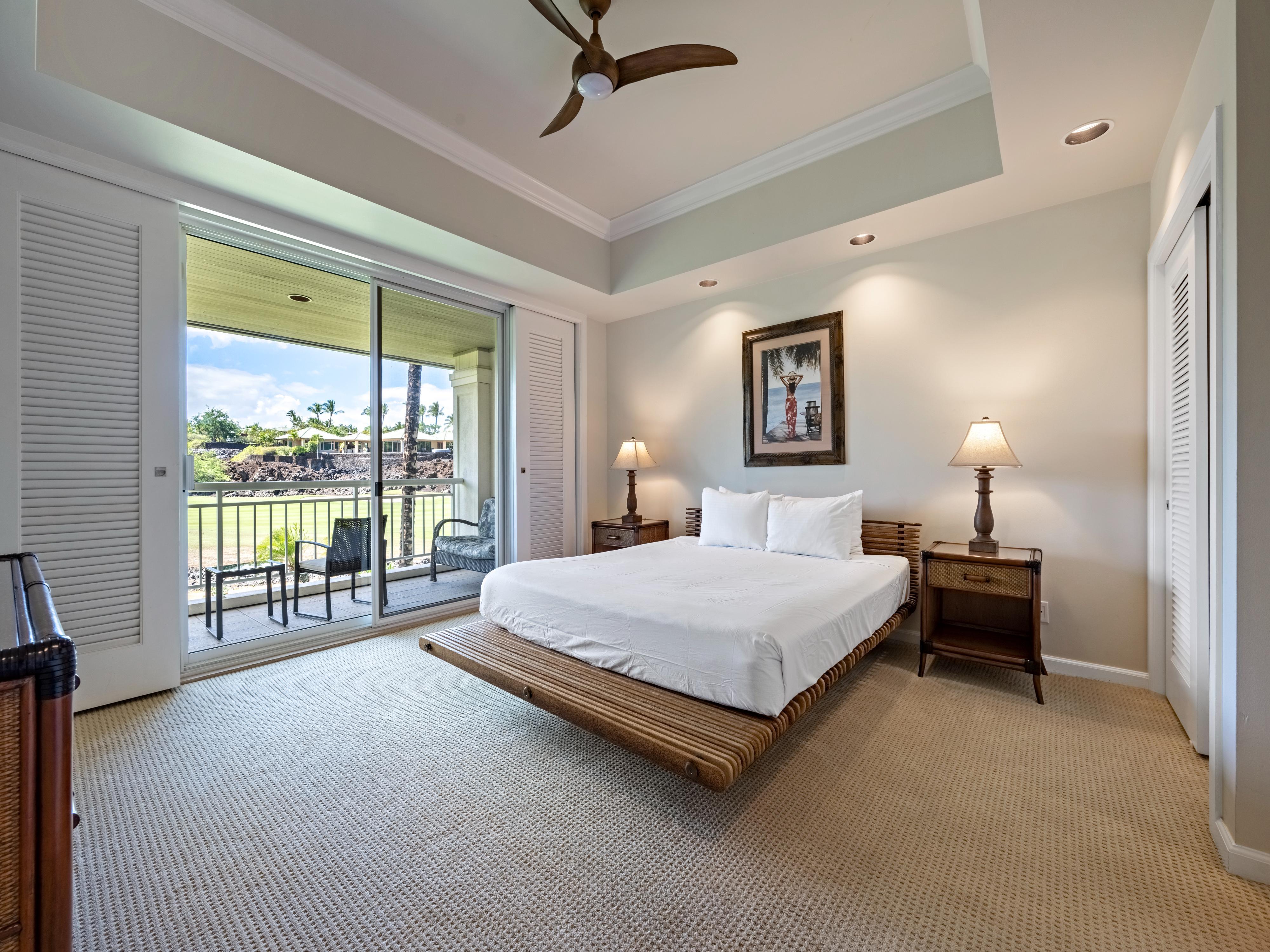 At 2,500 square feet of luxurious living space, the Islands at Mauna Lani B1 is the perfect option for a large and comfortable vacation rental on the Big Island that can sleep up to eight guests. Dual glass front doors in addition to three different sets of sliding doors on the ground floor and elevated cathedral windows in the living room all pour natural light into this home. They also provide constant views of the green Mauna Lani fairways and rugged black lava rock fields that surround the area.