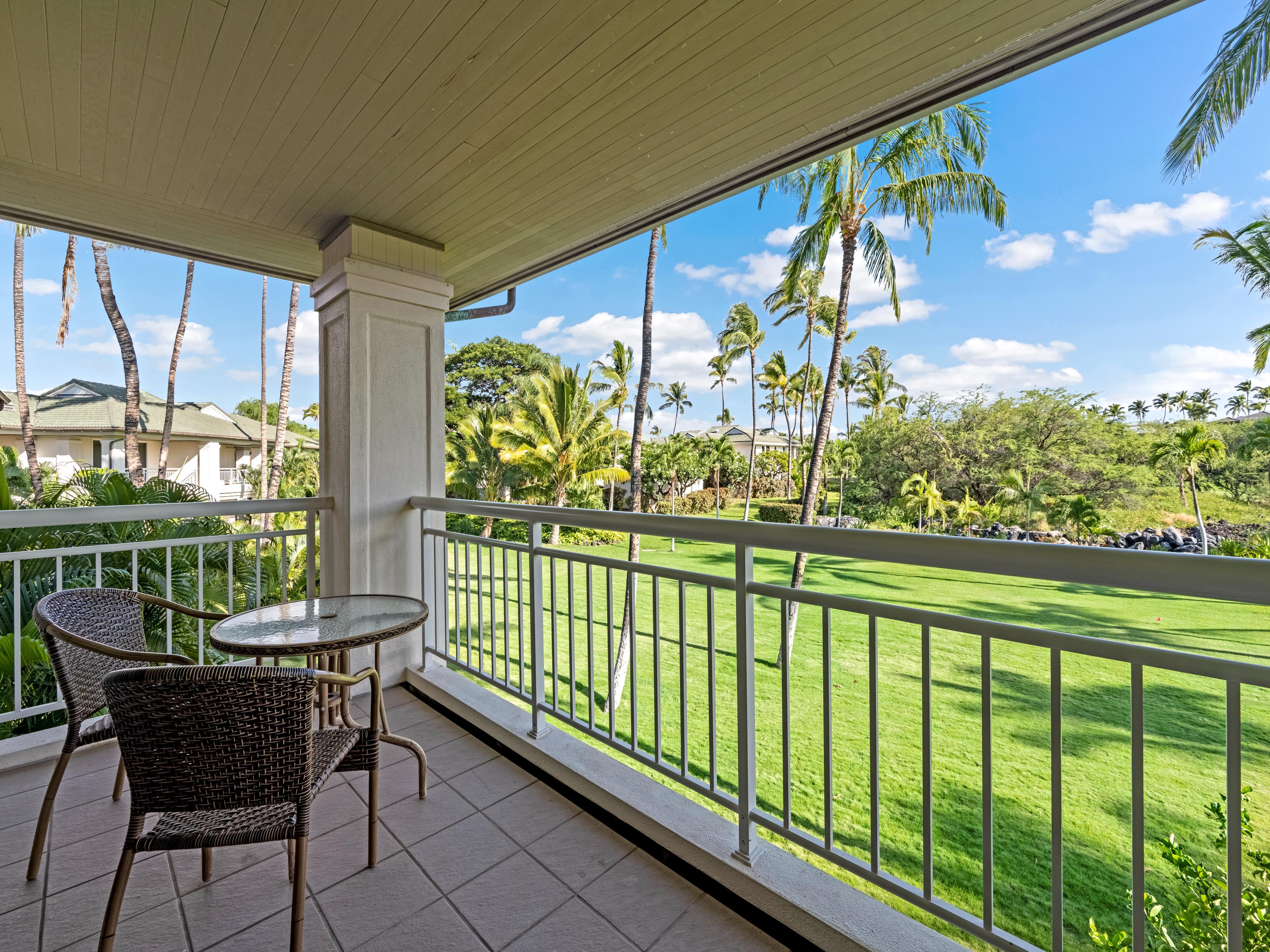 Just off the living room is a lanai with lounge chairs, table, and propane barbecue. Where this ground floor lanai ends, the lush Hawaiian landscaping begins. Take advantage of the huge flat grass lawn that extends for over 50 yards. Toss the football with the kids or teach a family member how to throw a frisbee so you can play on the beach later. The lawn is perfect for a sunset game of bocce ball as well!