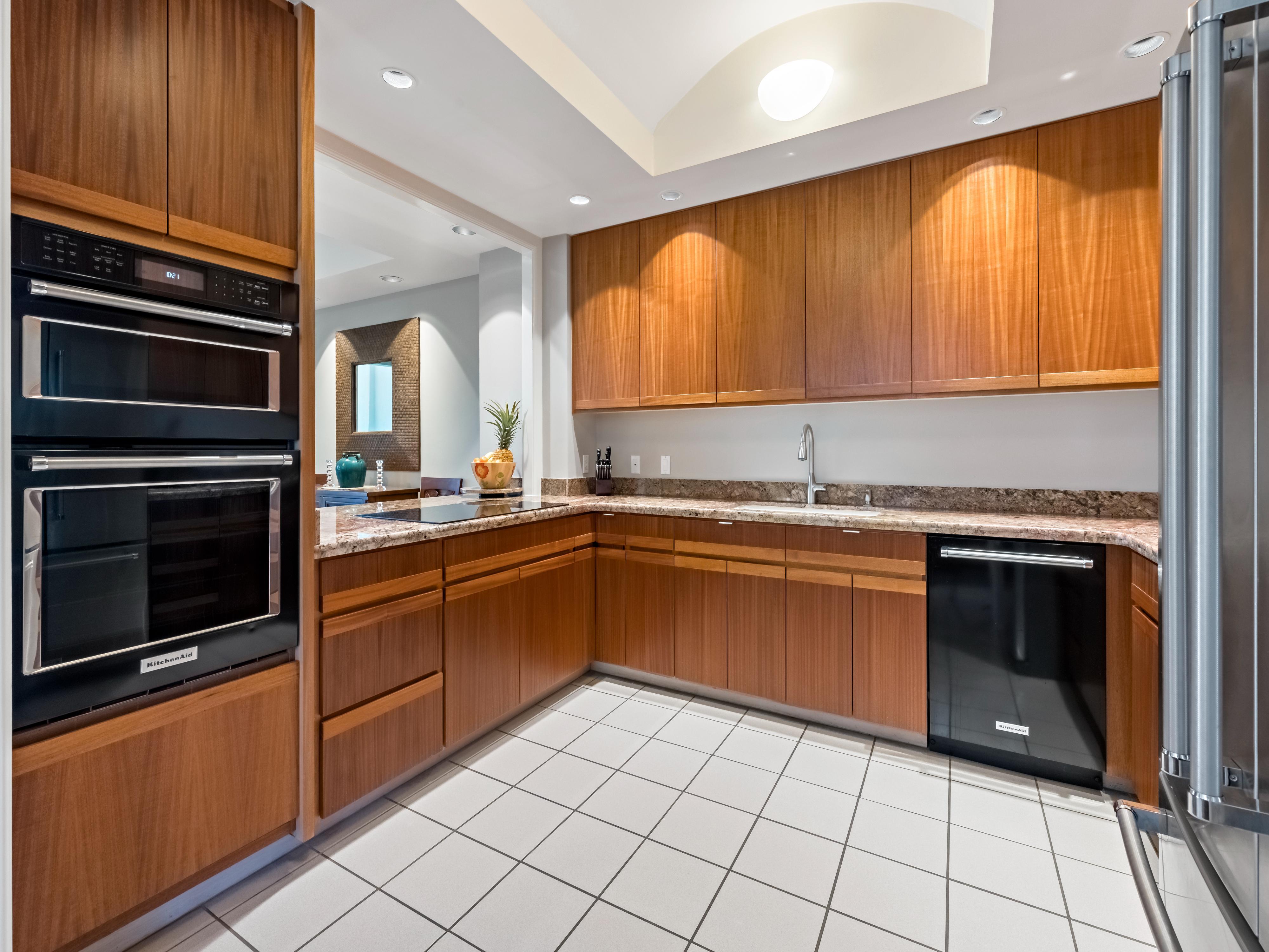 Fully equipped kitchen with modern appliances including a stove, oven, microwave, refrigerator, and dishwasher, alongside granite countertops