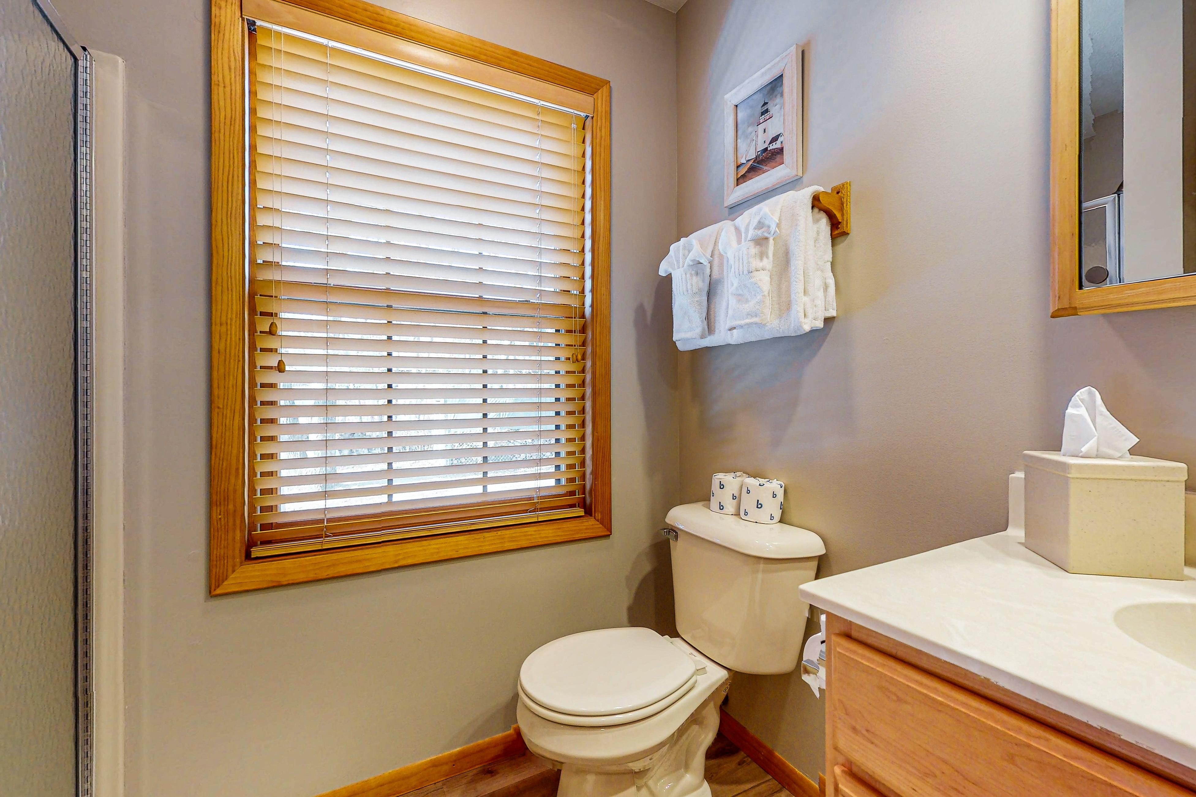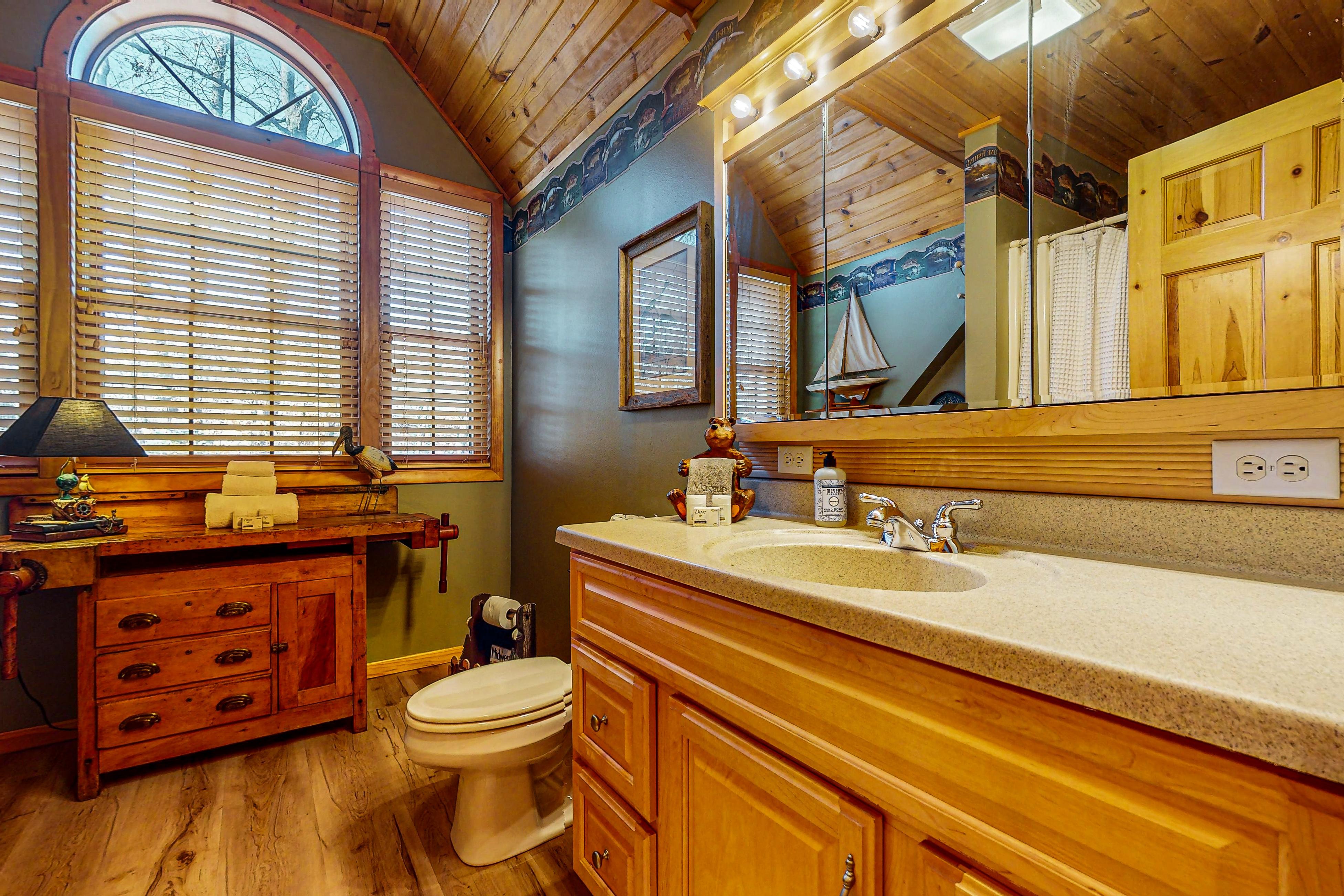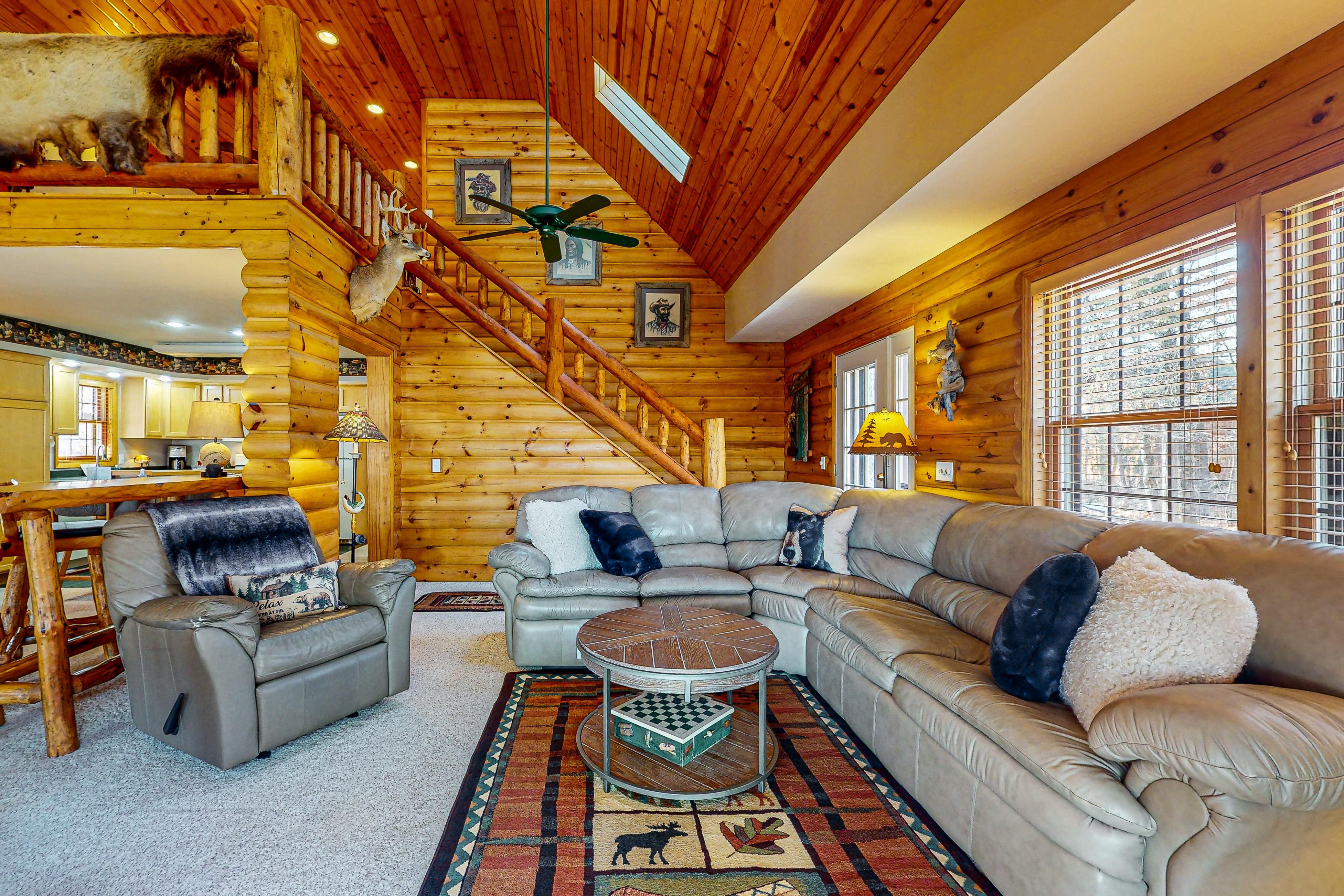 Inside, this cozy log cabin exudes a rustic charm with two loft areas, including one with a unique log ladder leading to a reading nook, offering a bird's eye view of the lake. There are three cozy bedrooms and 3 bathrooms, along with a futon and pull-out sofa bed providing sleeping arrangements for a total of 10. Guests can relax with their favorite cocktail or roast smores around the fire pit, grill on the gas grill, or enjoy a variety of indoor entertainment options such as board games, books, and puzzles. The home is also equipped with modern amenities like Roku & Netflix streaming, as well as free WiFi for added convenience.