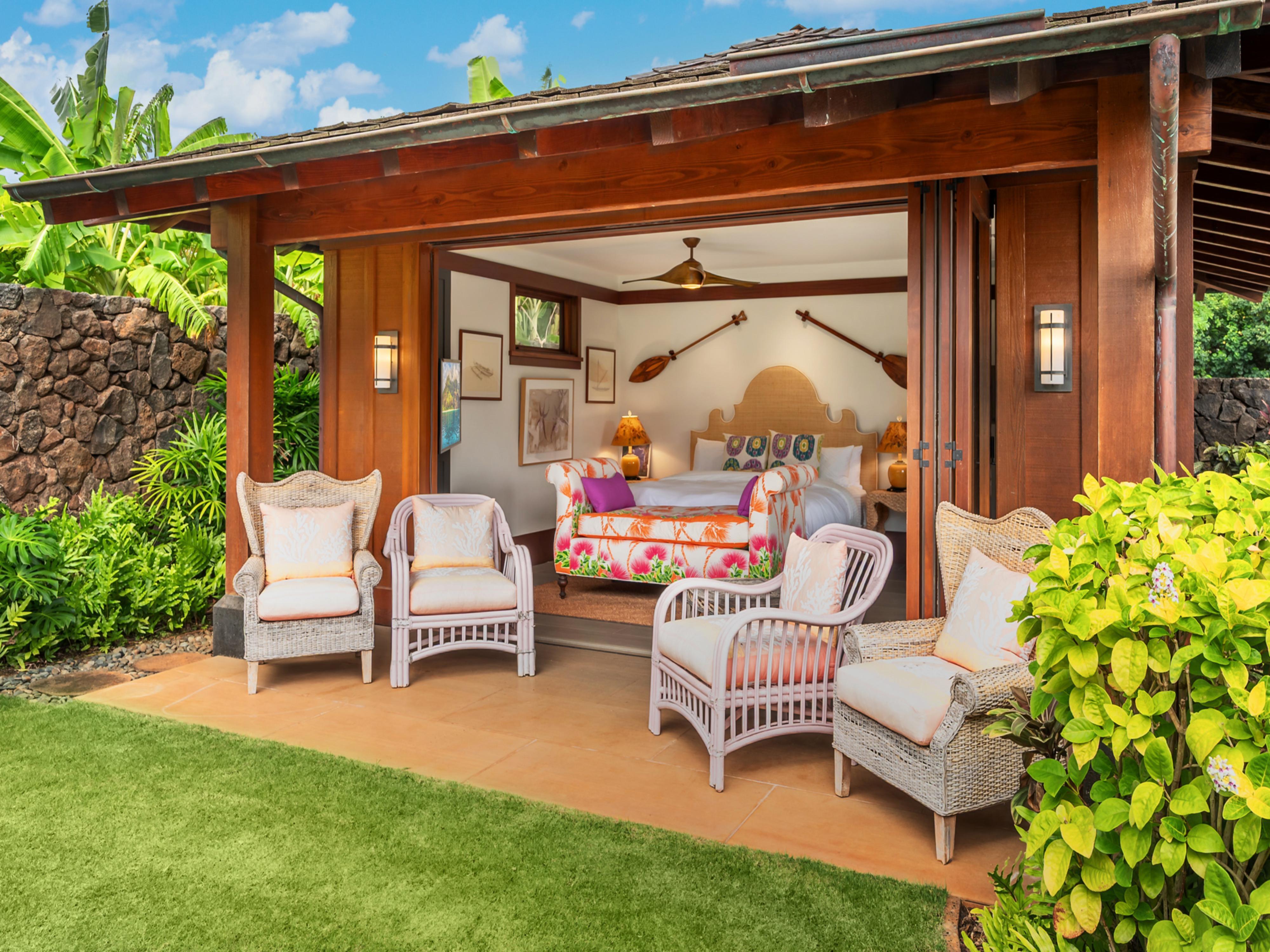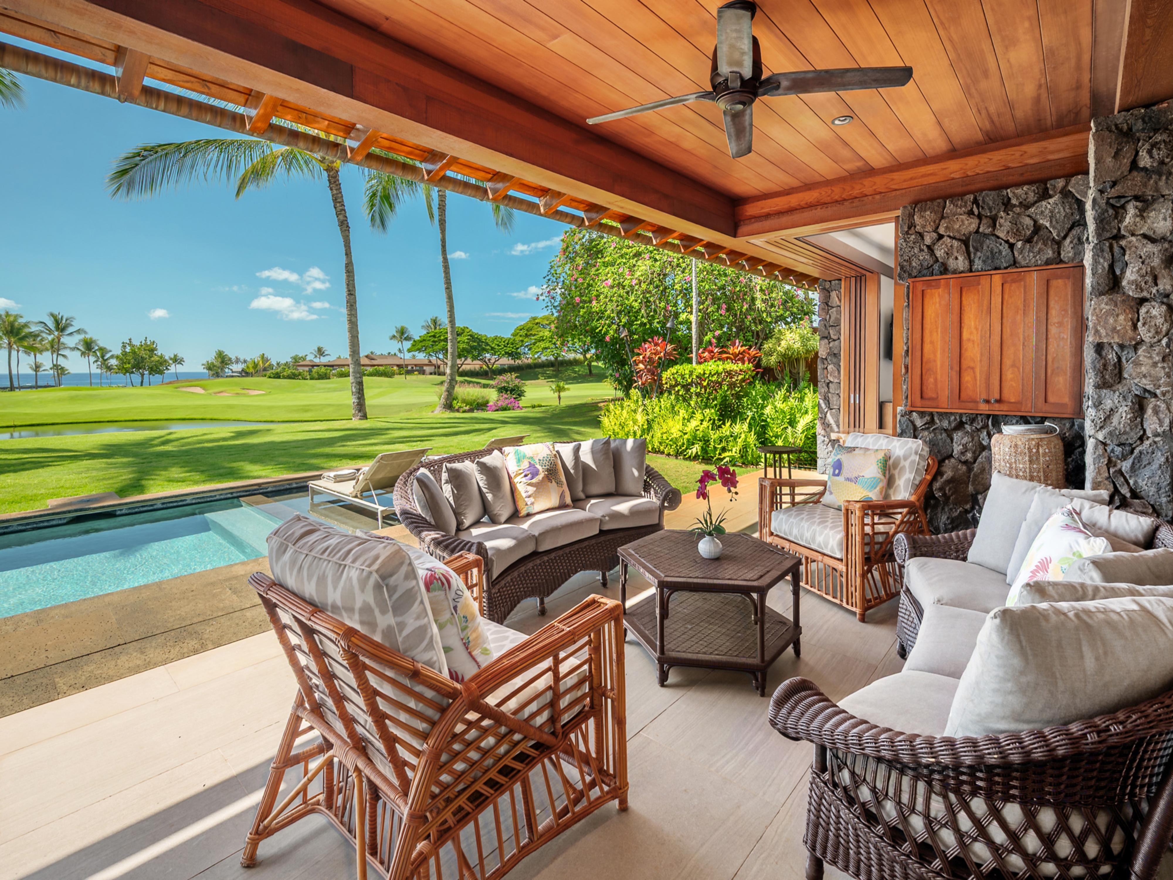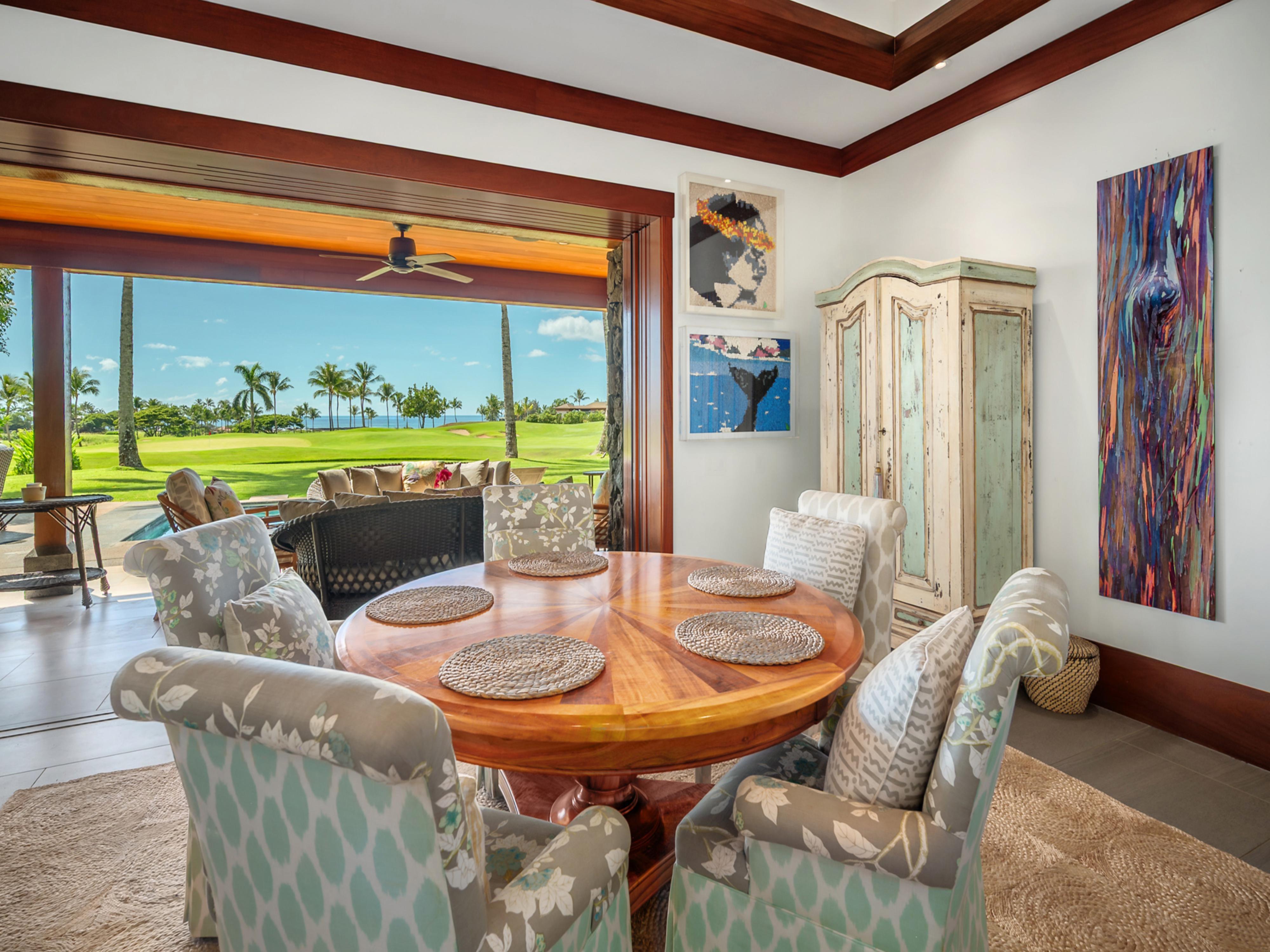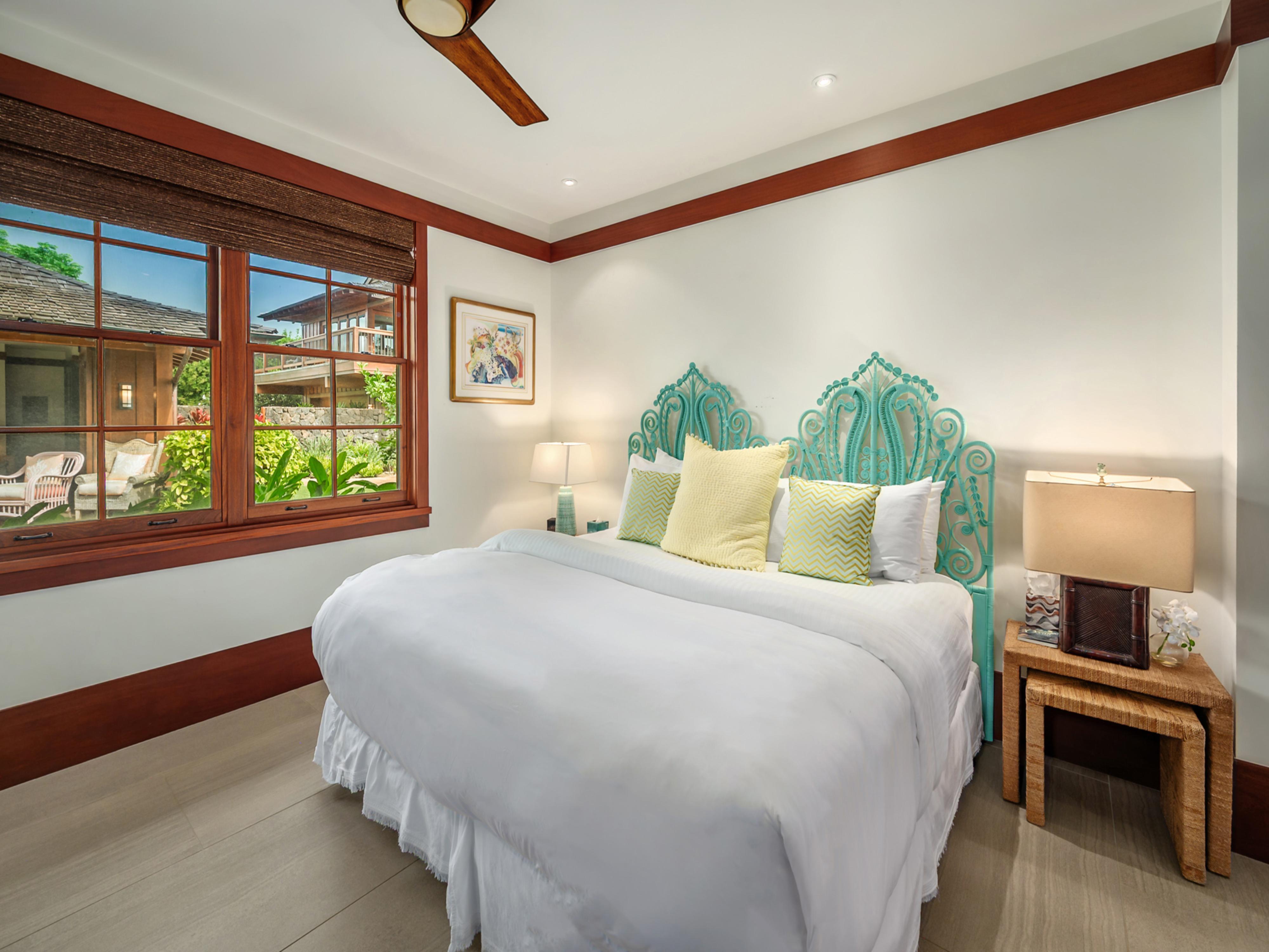 Step inside to find a thoughtfully designed layout that combines modern elegance with comfort. The primary bedroom features a plush king bed, while the second and third bedrooms offer twin beds that can be converted to a king bed upon request. The fourth bedroom is in a detached 'ohana with a king bed, ensuring everyone has a cozy place to rest.