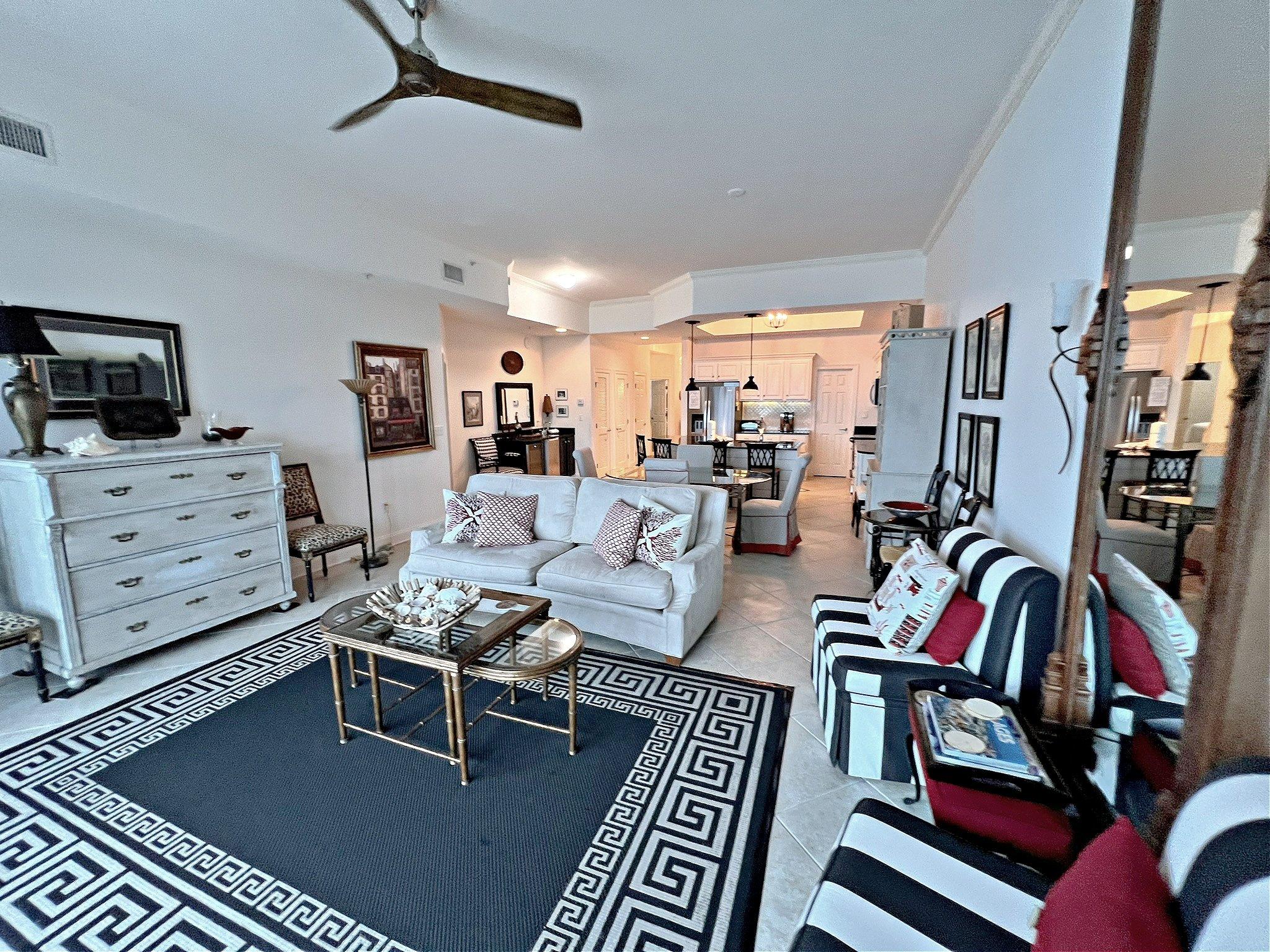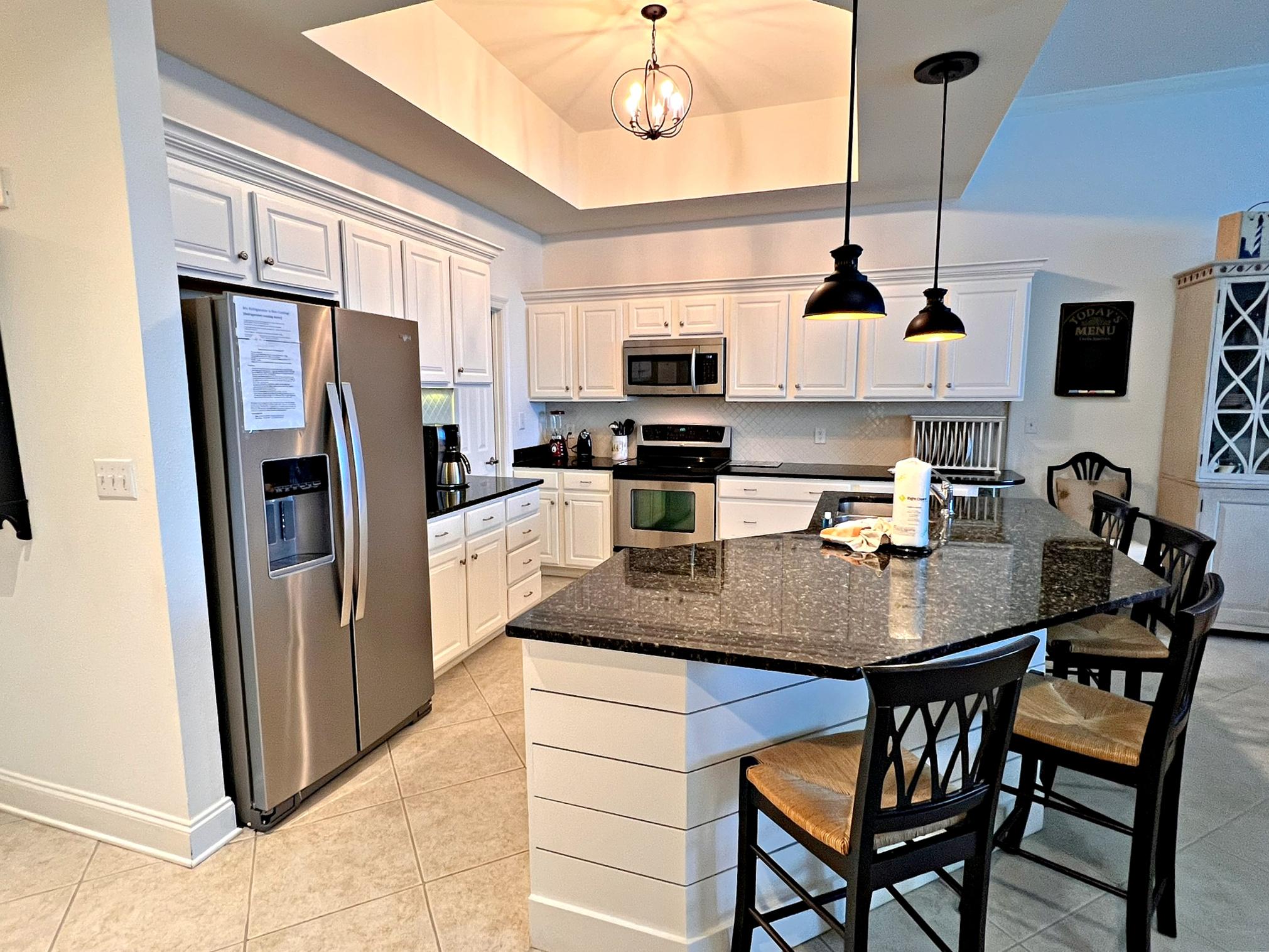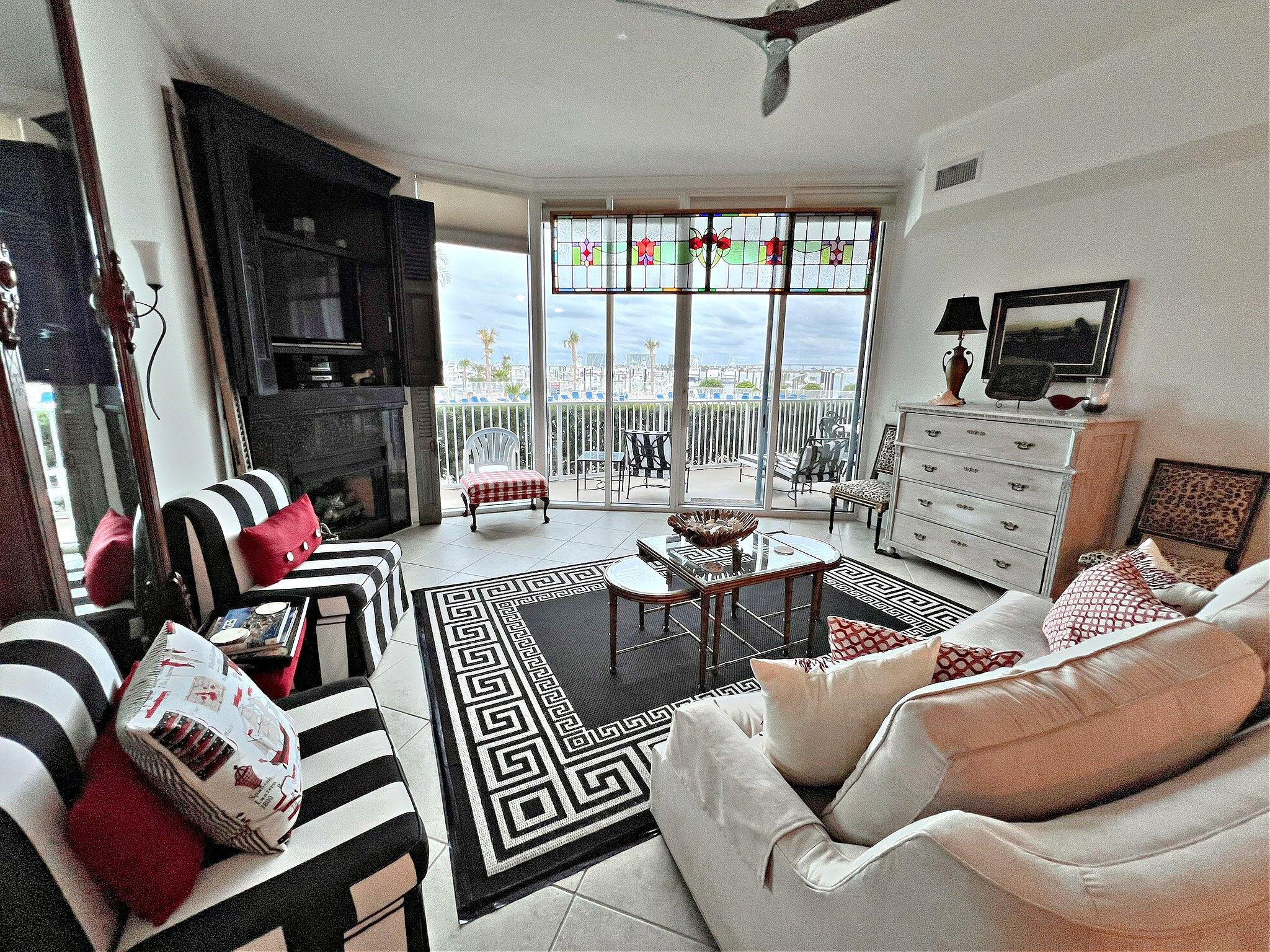 The interior of this condo is inviting and spacious. It features three roomy bedrooms. The master bedroom has a king-sized bed, a flat-screen TV, an attached bathroom with a walk-in shower and a large tub, and a balcony with views of the pool and the bay. The second bedroom has a queen-sized bed, an attached bathroom, and a flat-screen TV. The third bedroom features two twin beds, a flat-screen TV, and a private attached bath. The open and comfortable living area boasts ample seating around a gas log fireplace. The dining area offers seating for the entire family and provides a beautiful view of the pool and the harbor, which you can also enjoy from your private first-floor balcony. The kitchen is fully equipped with plenty of dishes and cookware, as well as a spacious walk-in pantry. A full-sized laundry room inside the unit adds to your convenience, and free Wi-Fi is available during your stay.
