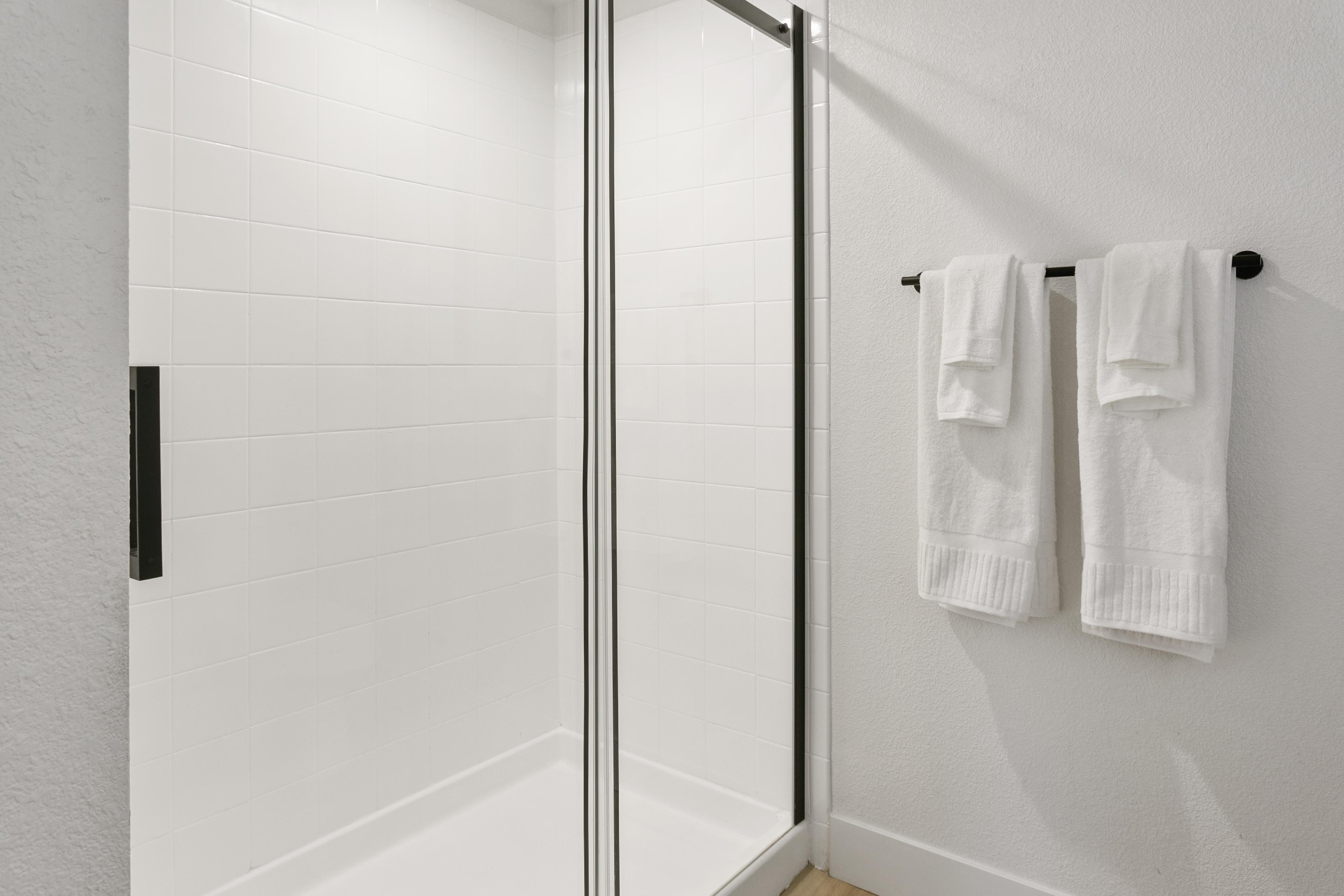 • Walk-In, Glass Enclosed Showers with Rainfall Showerheads
