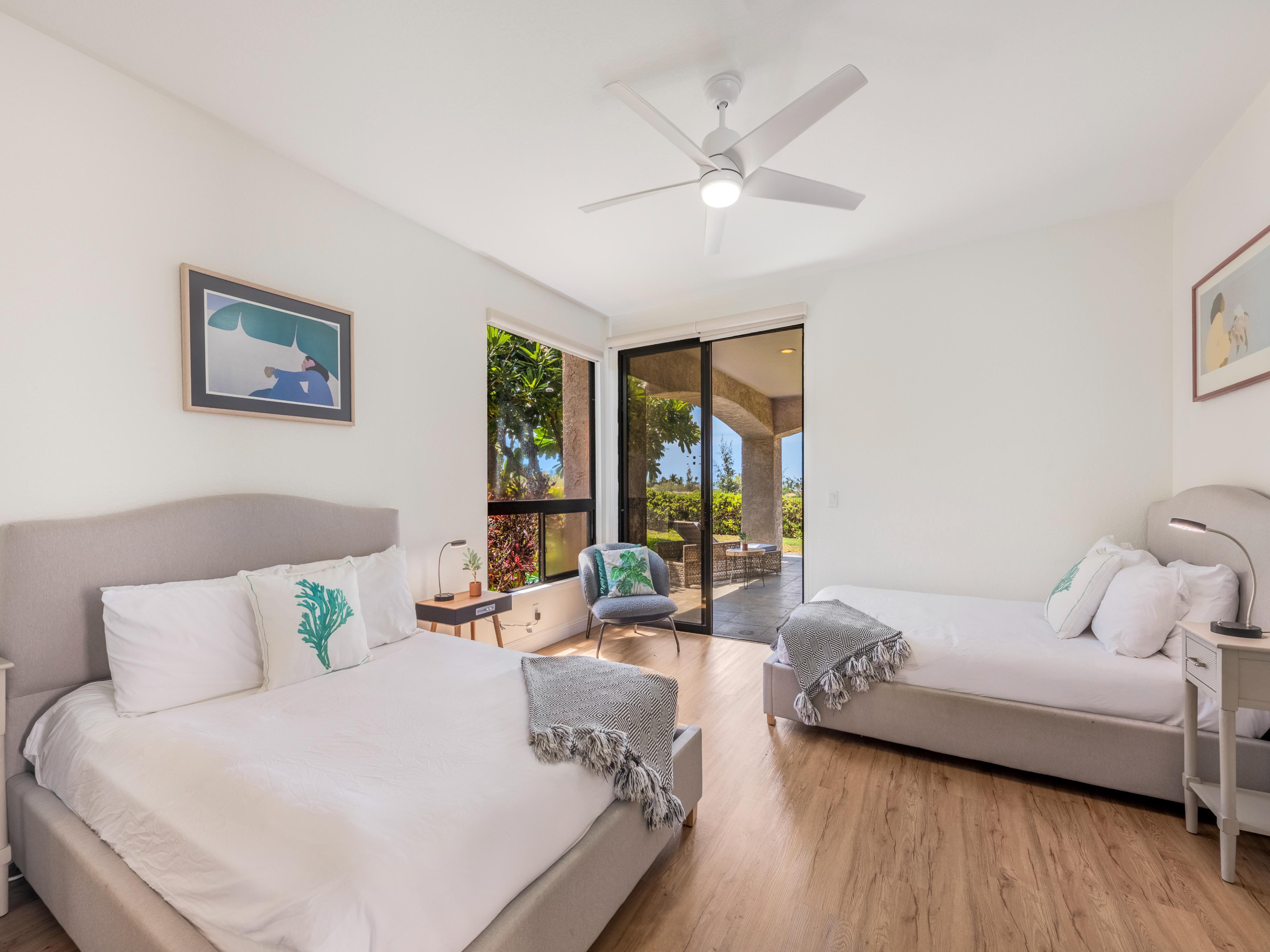 The second bedroom is equipped with two full beds and also enjoys access out onto the lanai. Guests can conveniently access the second bathroom that features special touches like a tropical stained-glass window, an exercise bike, and additional closet space.