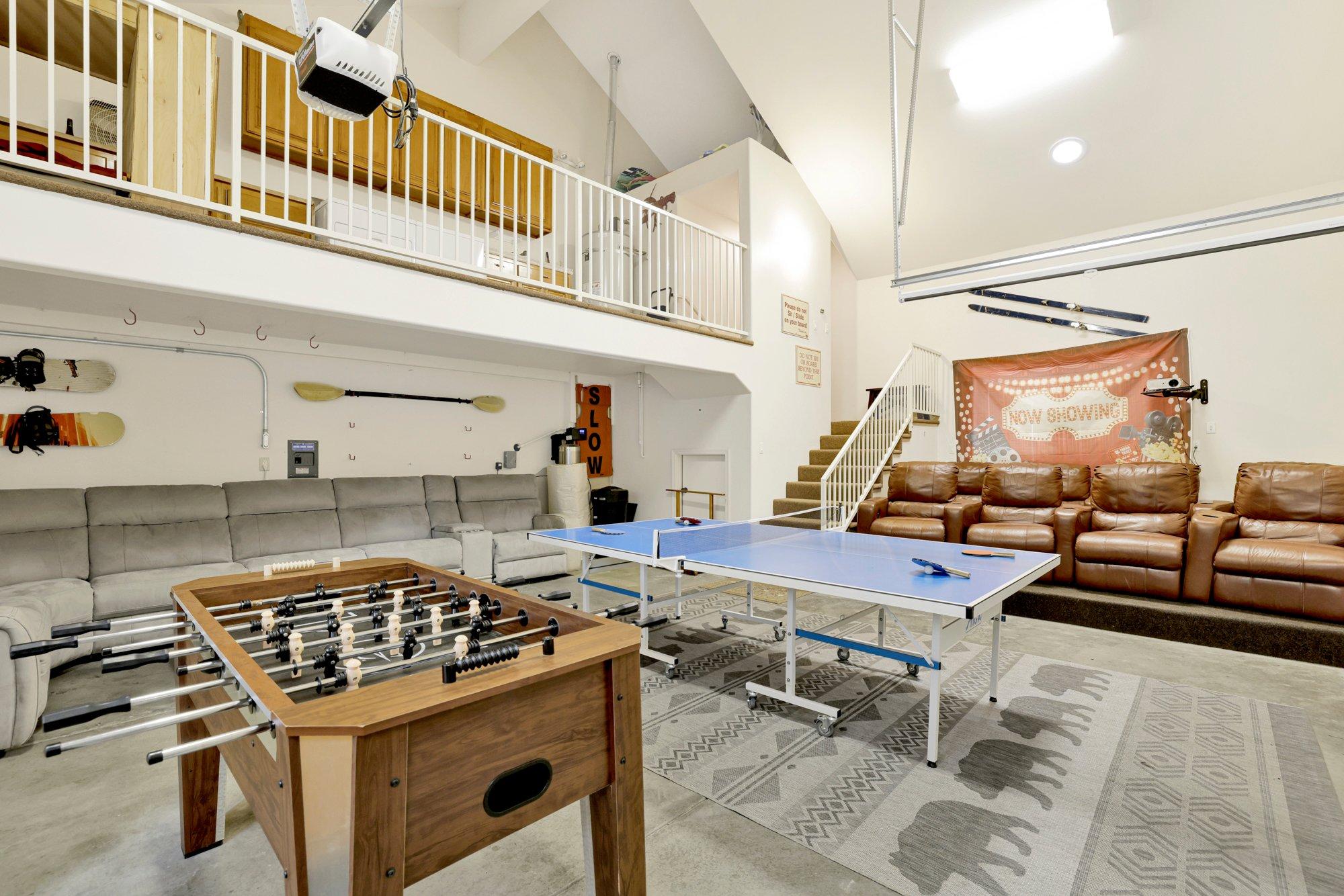 The upstairs loft level above the living room comes complete with a pool table, two small bar TVs for game watching, and a remote working station to hammer out some quick Zoom calls so you don't have to take PTO for the day. Both upstairs bedroom suites meet in the middle at the pool table. The Multi-family room on the right is designed for hanging out with bean bags, smart TV, Nintendo, kids playroom, and two triple bunks for maximum sleeping space. The playroom is nothing shy of a toy store! Literally, drop your suitcases at the door and watch the kids disappear! From race cars, army men, and drones to barbies, a play kitchen, and puzzles––you won't hear, “I'm bored,” until you hit the road home. And good luck with the, “Are we there yets” :) The master suite to the left has a king bed, fireplace, and private bathroom with spa tub and shower. The downstairs master suite also has a king bed, fireplace, and across the hall is a giant mud room, an extra-large washer & dryer set, great for those who need to do laundry after a day at the slopes, hiking, or the lake. The garage has been converted into a massive bonus room with eight full-reclining theater chairs and a 10' foot projector screen, candy wall, popcorn machine, ping pong table, foosball table, reclining couch, and more!