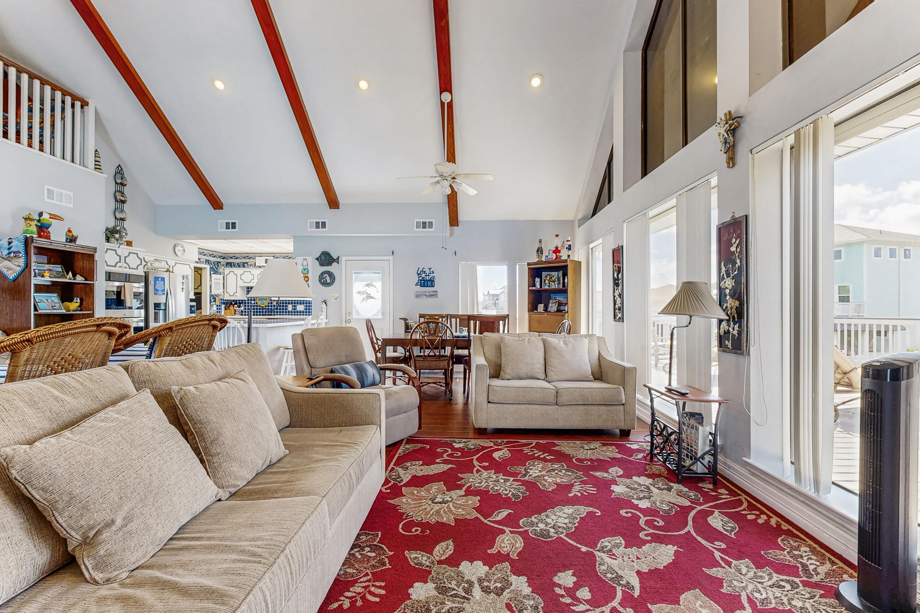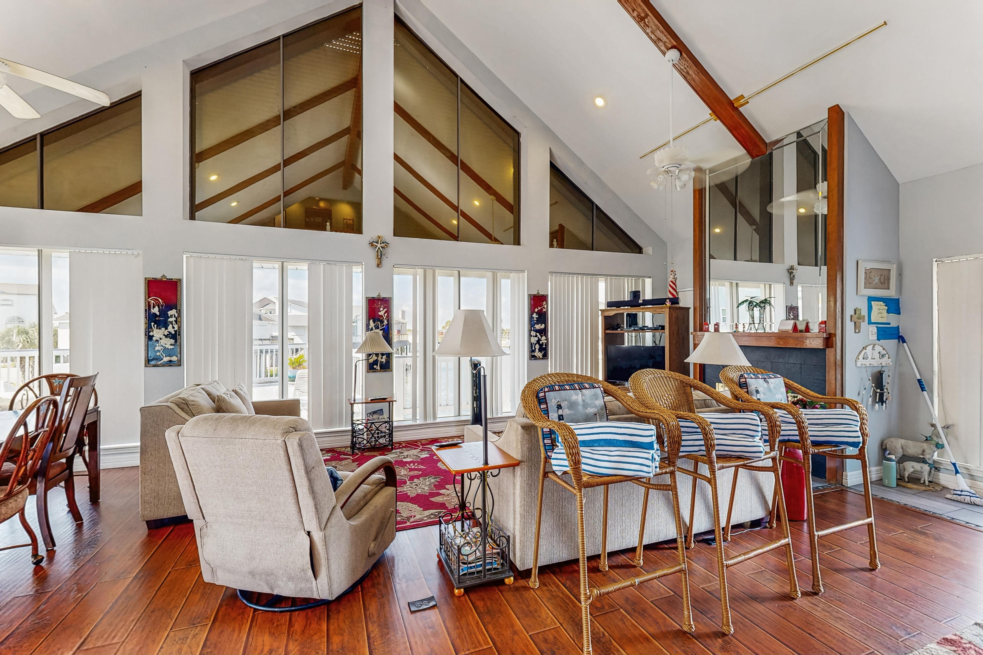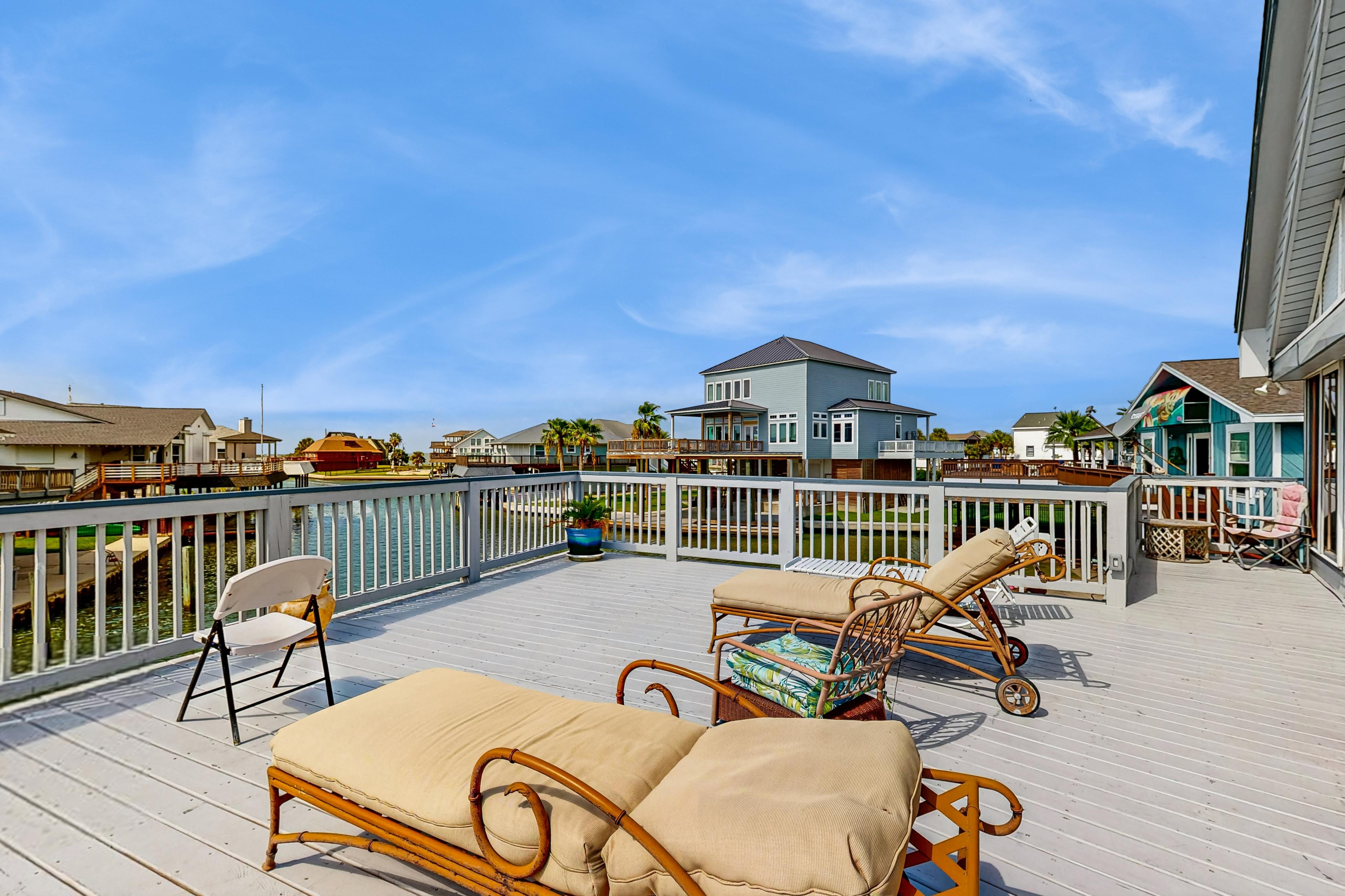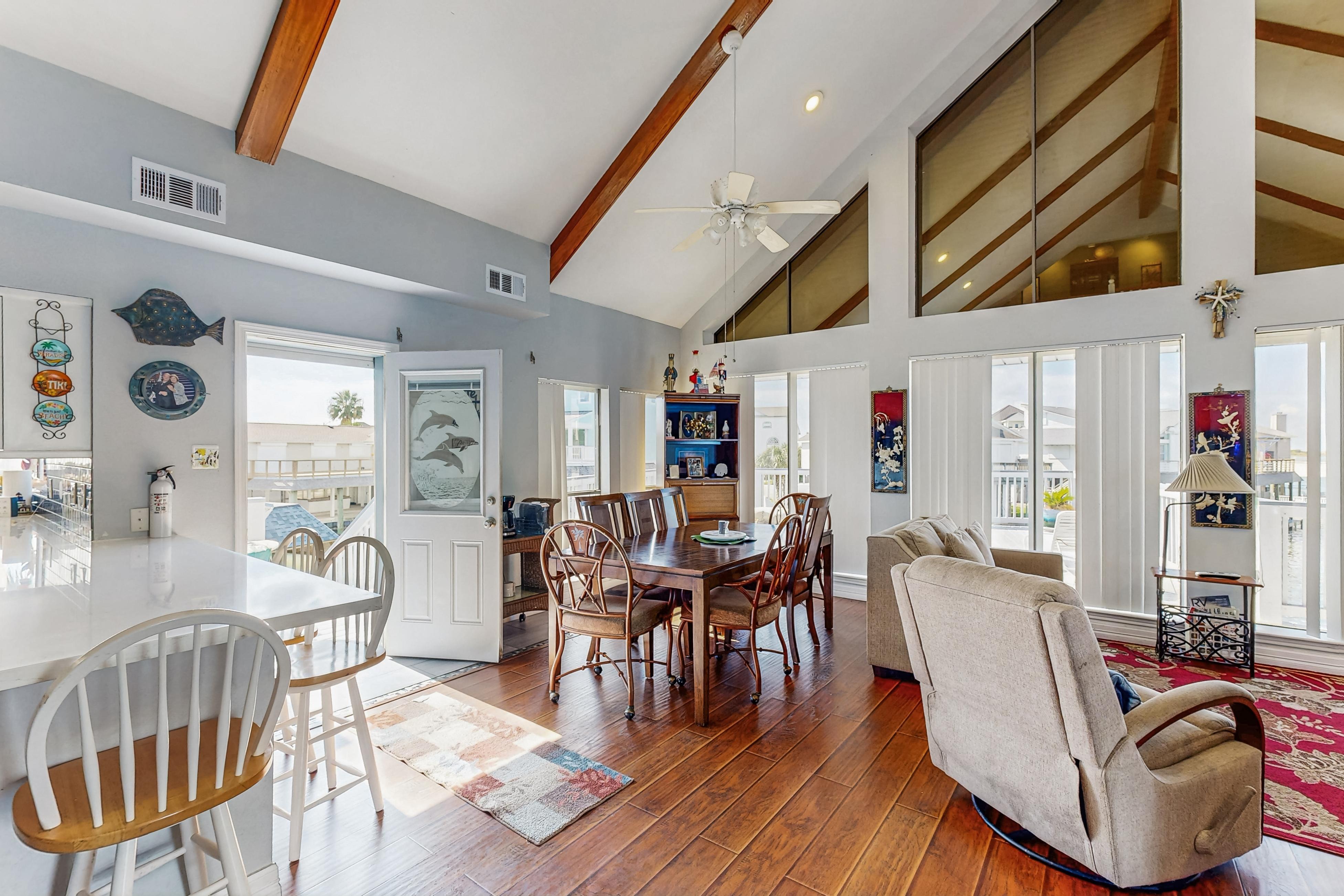 Being one of the few vacation rentals on Tiki Island, Tiki Hideaway will give you a rare opportunity to get away from it all and real with loved ones in style. This home is perched right on the canal which will make for a relaxing setting to sip a cocktail on the deck or cup of coffee each morning before venturing out. The interior of this home is fun and eclectic, as every room has unique wallpaper and decor to give each space a new feel. Not to mention, the fully equipped kitchen boasts intricate tile, all of the major appliances needed for preparing tasty recipes, and plenty of room for multiple cooks to show off their skills. If you are looking for a more casual option, fire up the gas grill on the shaded lower patio and cook up some burgers. Don't worry about leaving the furry members of the family at home, as this getaway is dog-friendly!