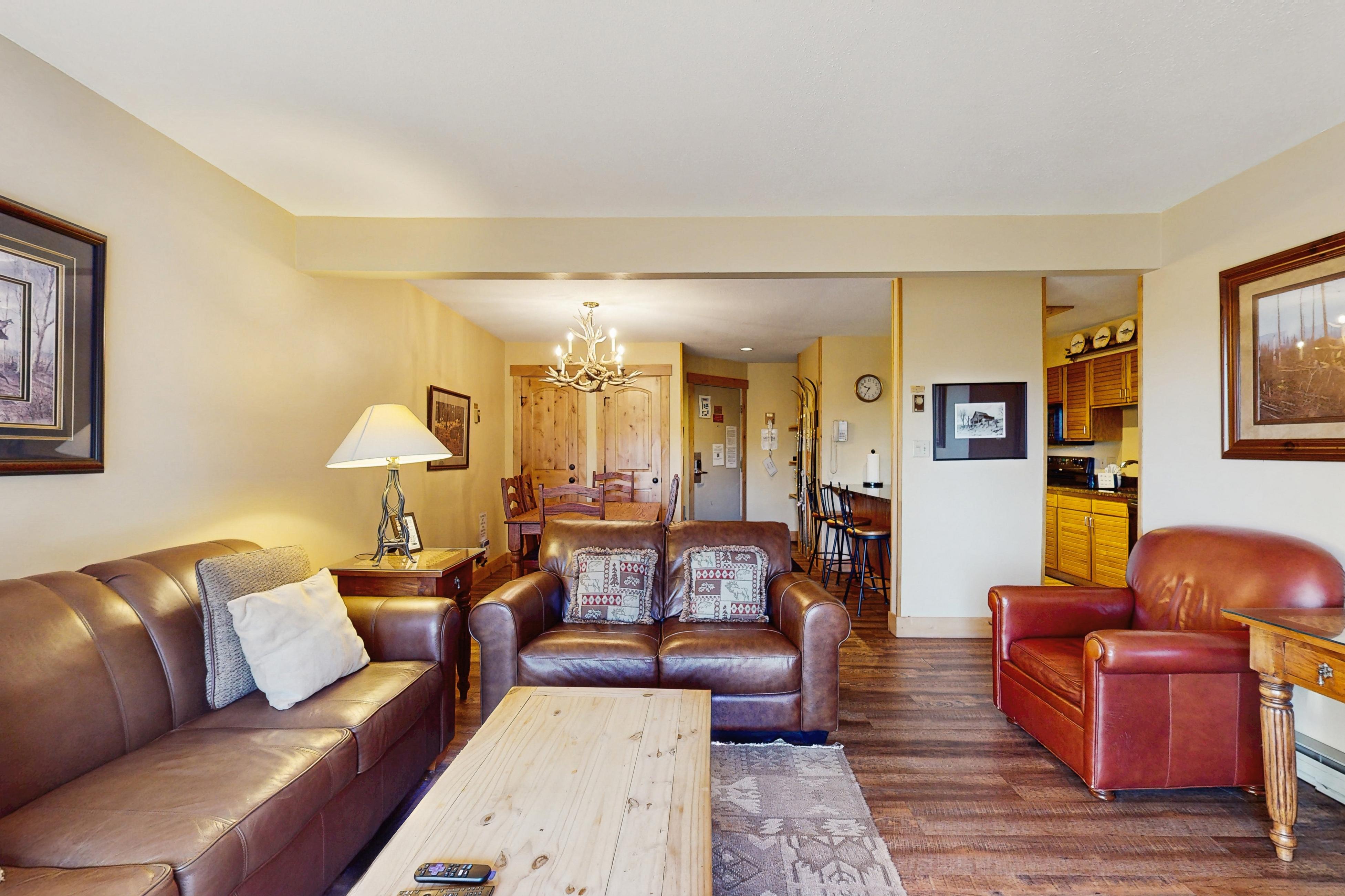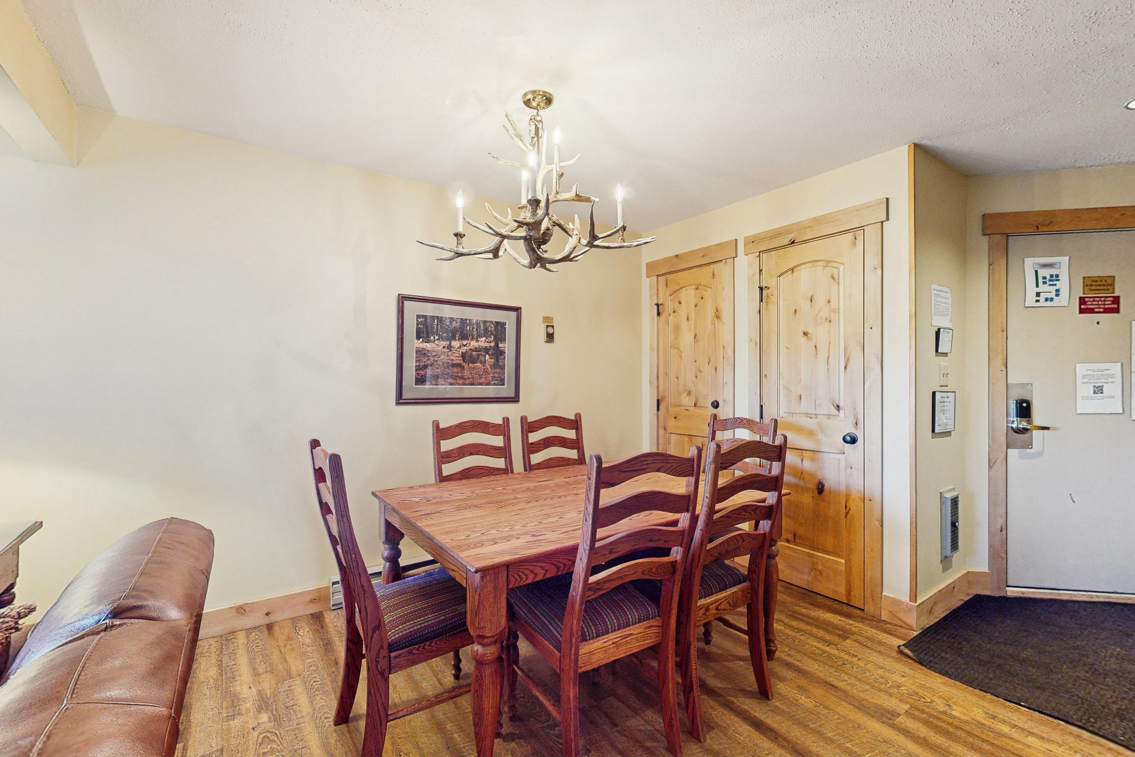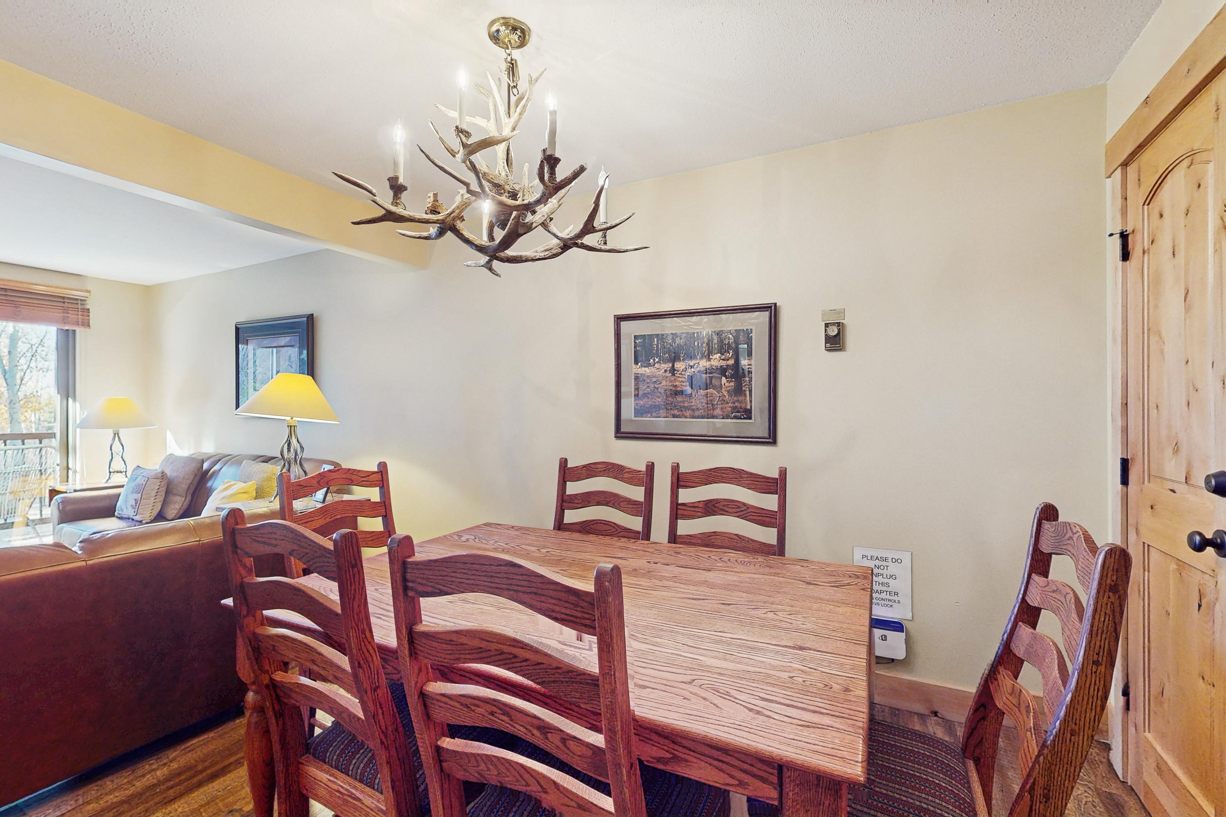 Timber Run 113 is a spacious two-bedroom condo. The home features a well-equipped kitchen with a breakfast bar and a dining area with a large table. The living area has comfortable furnishings, vaulted ceilings, a cozy gas fireplace, and access to the private balcony, perfect for enjoying the fresh mountain air. A sofa bed provides an extra sleeping space. The condo has two TVs and free WiFi for your enjoyment.