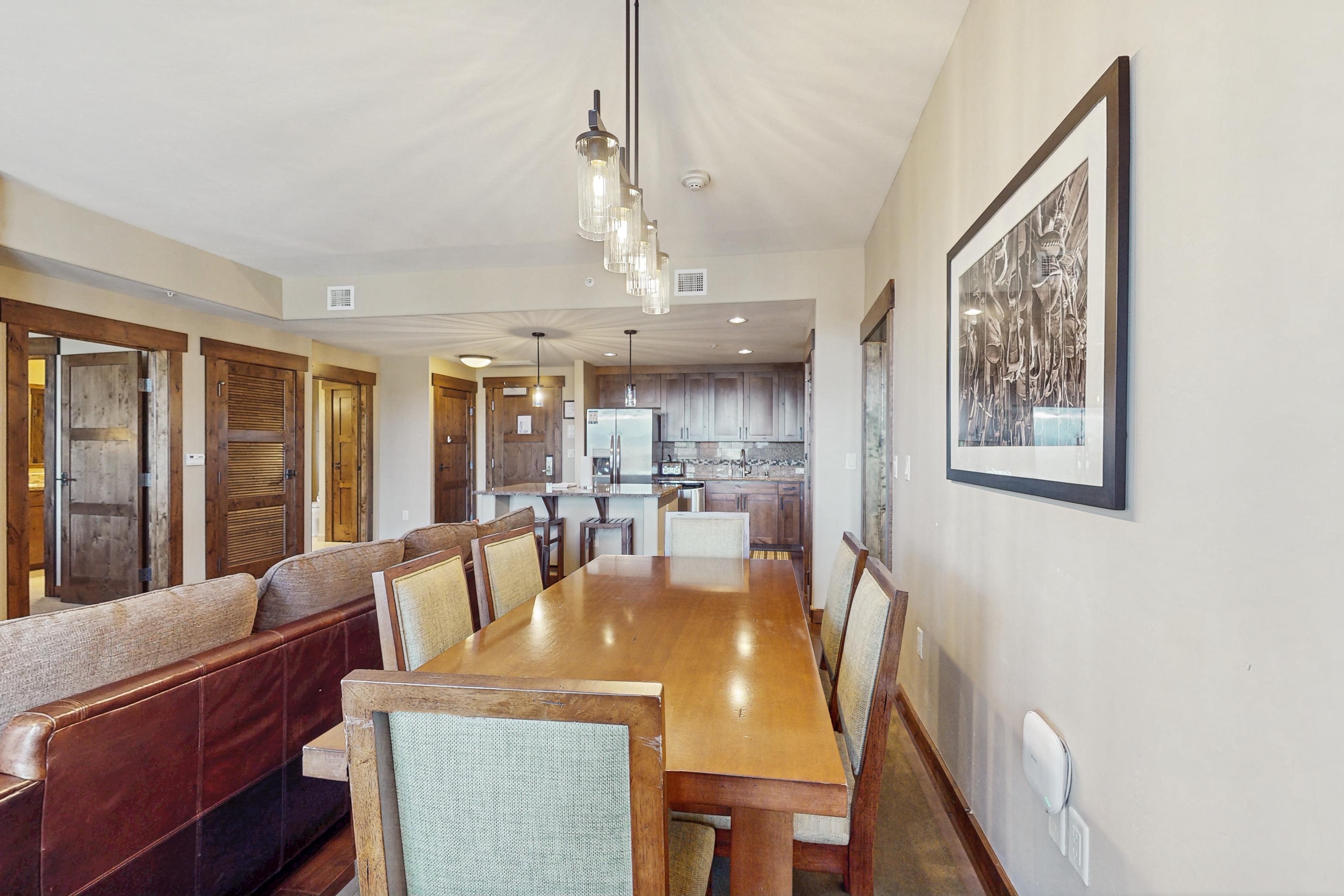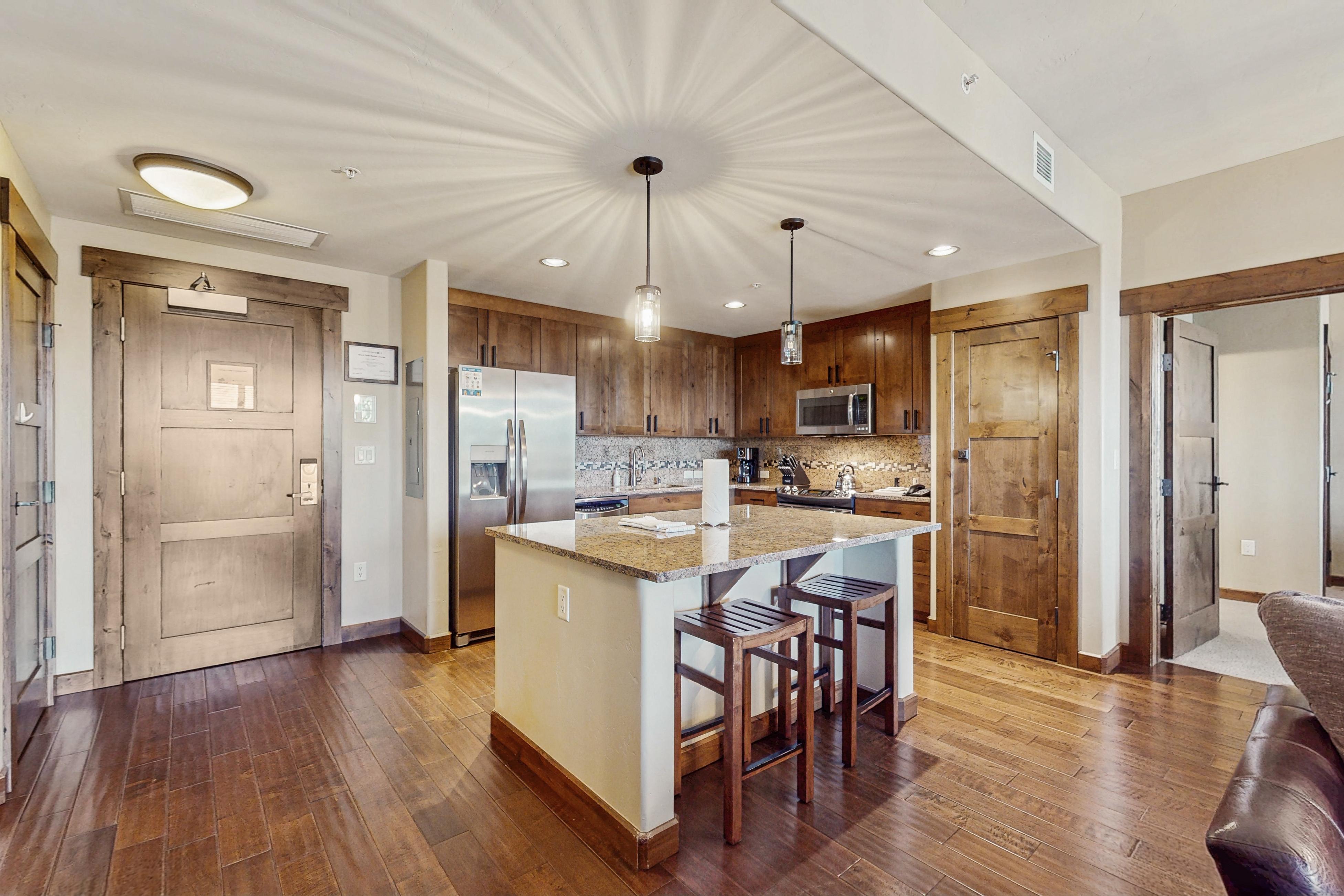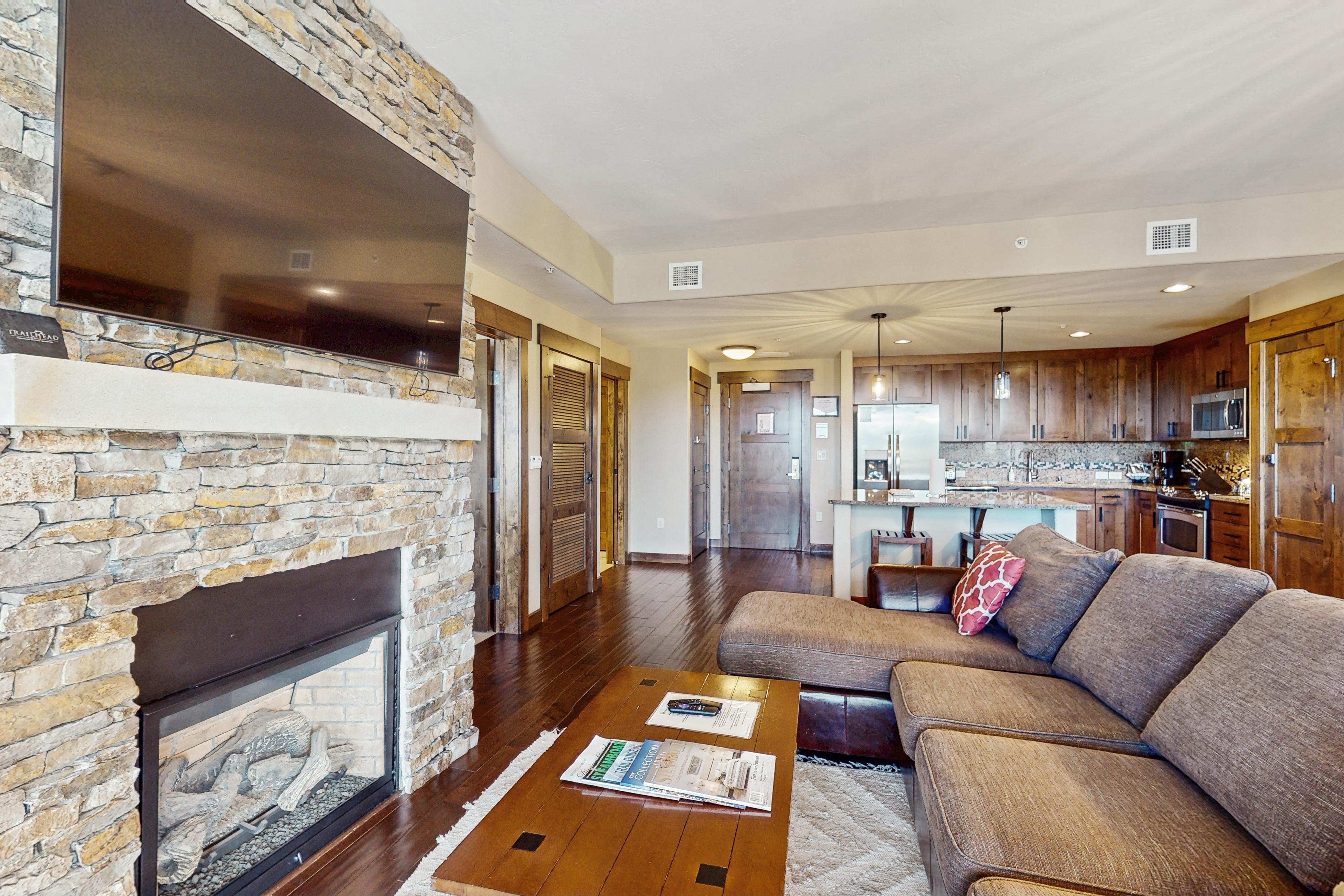 Convenience, luxury, access to incredible shared amenities, and views you won't forget anytime soon are what this family-friendly mountain condo offers for its lucky guests. Treat your family or friends to an unforgettable ski-cation at Trailhead Lodge 4115. A warm interior with wood accents give this retreat a homey feeling and modern appliances add a luxury touch that isn't so simple to find. Cozy up on the couch and turn on the flatscreen TV for an enjoyable afternoon at home. Whenever hunger strikes, put on the chef's apron and let your creativity flow in the fully-equipped kitchen. Modern, stainless steel appliances and utensils will make cooking a breeze.