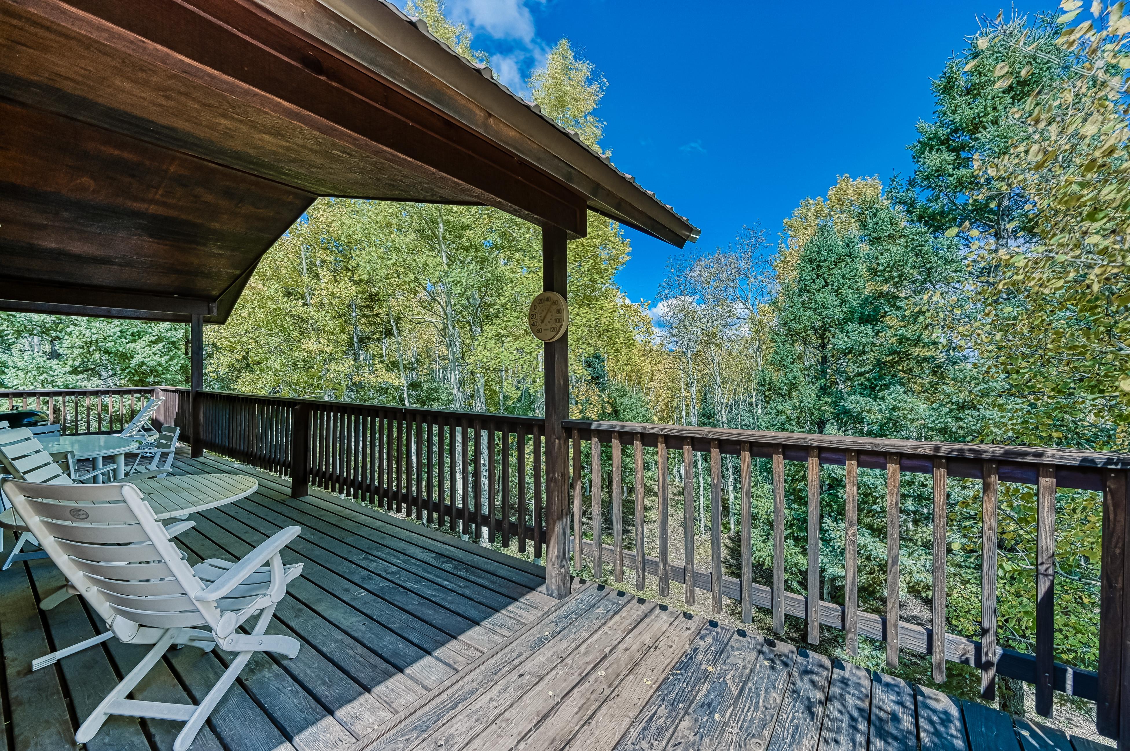 The open living area features a TV with Dish Network service and a wood-burning fireplace so you can sit and relax with family and friends. Get cozy and enjoy the intimate nature of the fireplace in the main bedroom. There's also an indoor hot tub and sauna for ultimate relaxation. A beautiful wraparound deck offers views of the surrounding aspen trees, making it really feel like you are away from it all!