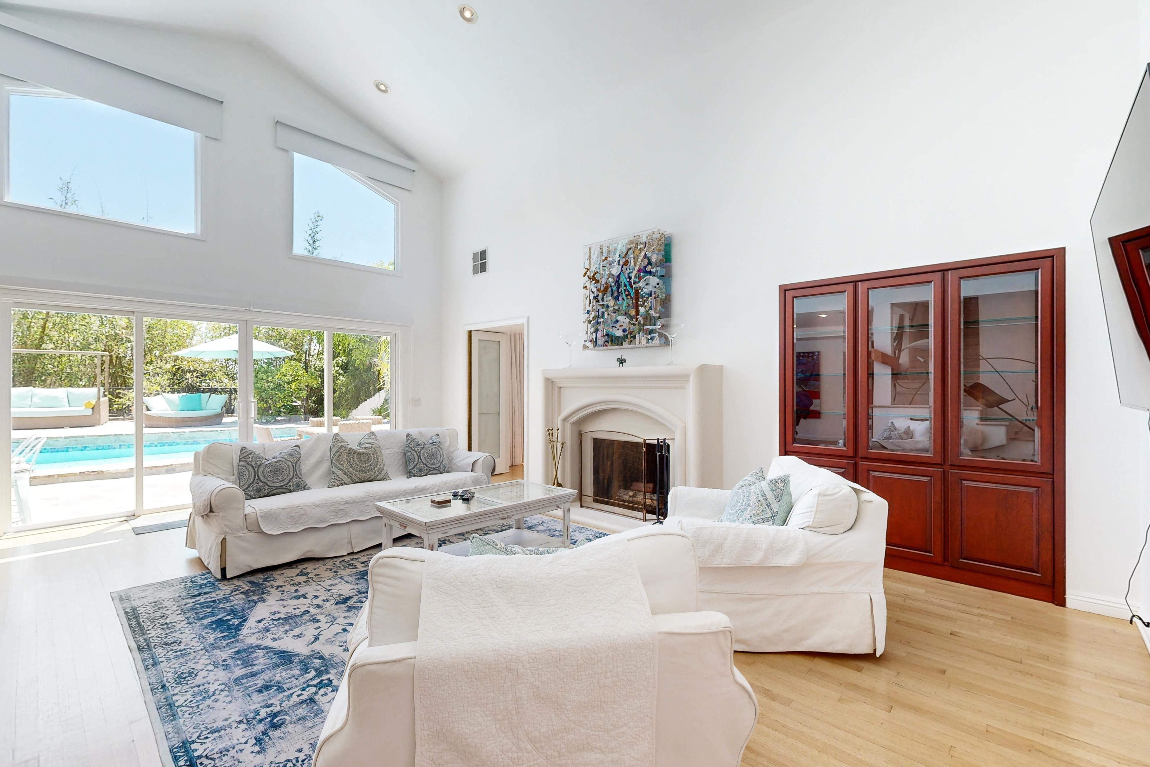 Vaulted ceilings soar above the living area, and large windows deliver an abundance of California sunshine. The gas fireplace and modern artwork complete the sophisticated setting. Stream shows on the smart TV.