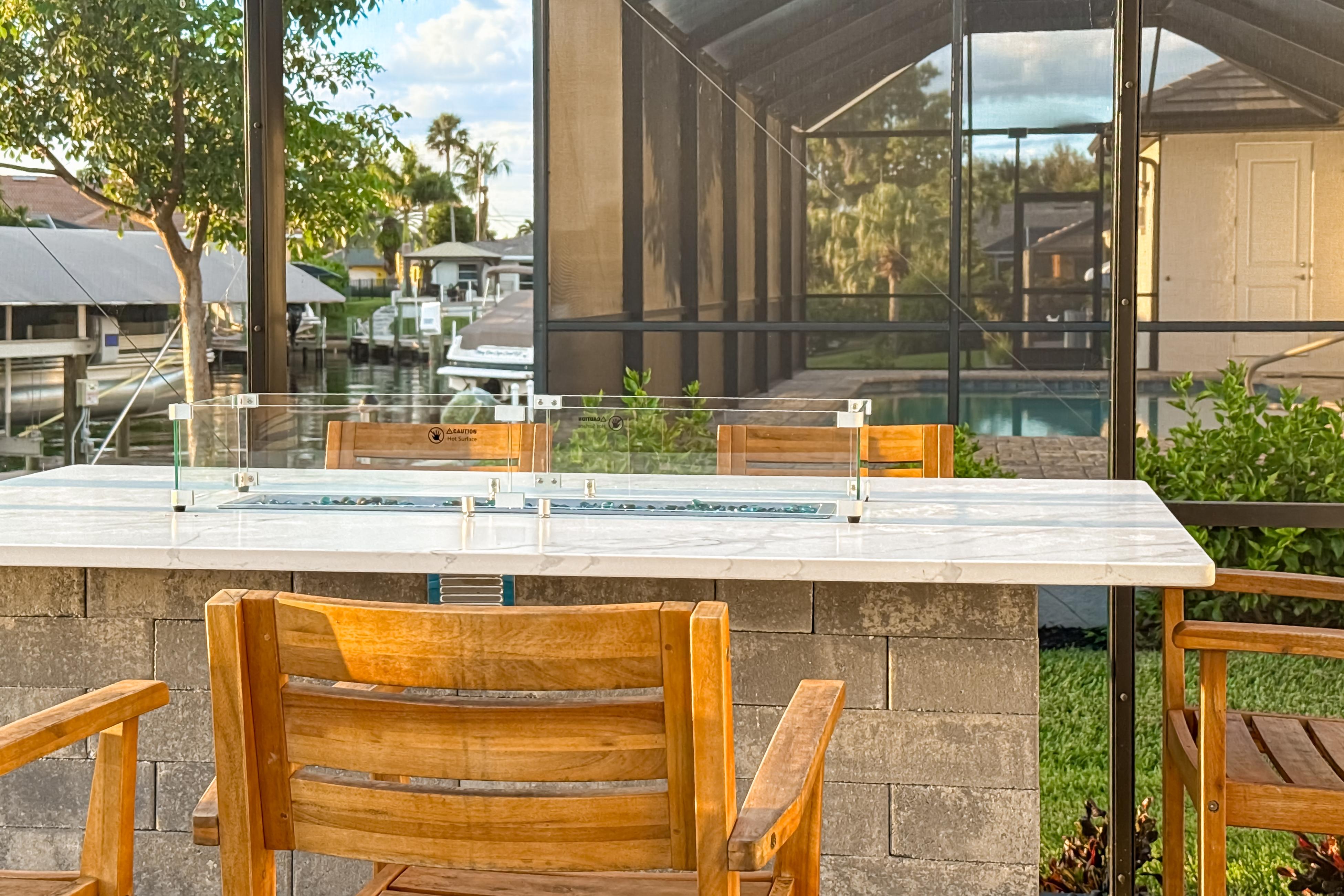 The open-concept floor plan provides a seamless flow from the living area to the outdoors, where you'll enjoy a screened lanai with a large heated saltwater pool, water features, and ample lounge seating surrounding a custom fire table. Entertain with ease using the fully equipped outdoor kitchen, complete with a built-in grill, sink, vent hood, and beverage refrigerator. Enjoy stunning western sunsets from the canal-front gazebo, complete with ambient lighting for cozy evenings by the water.