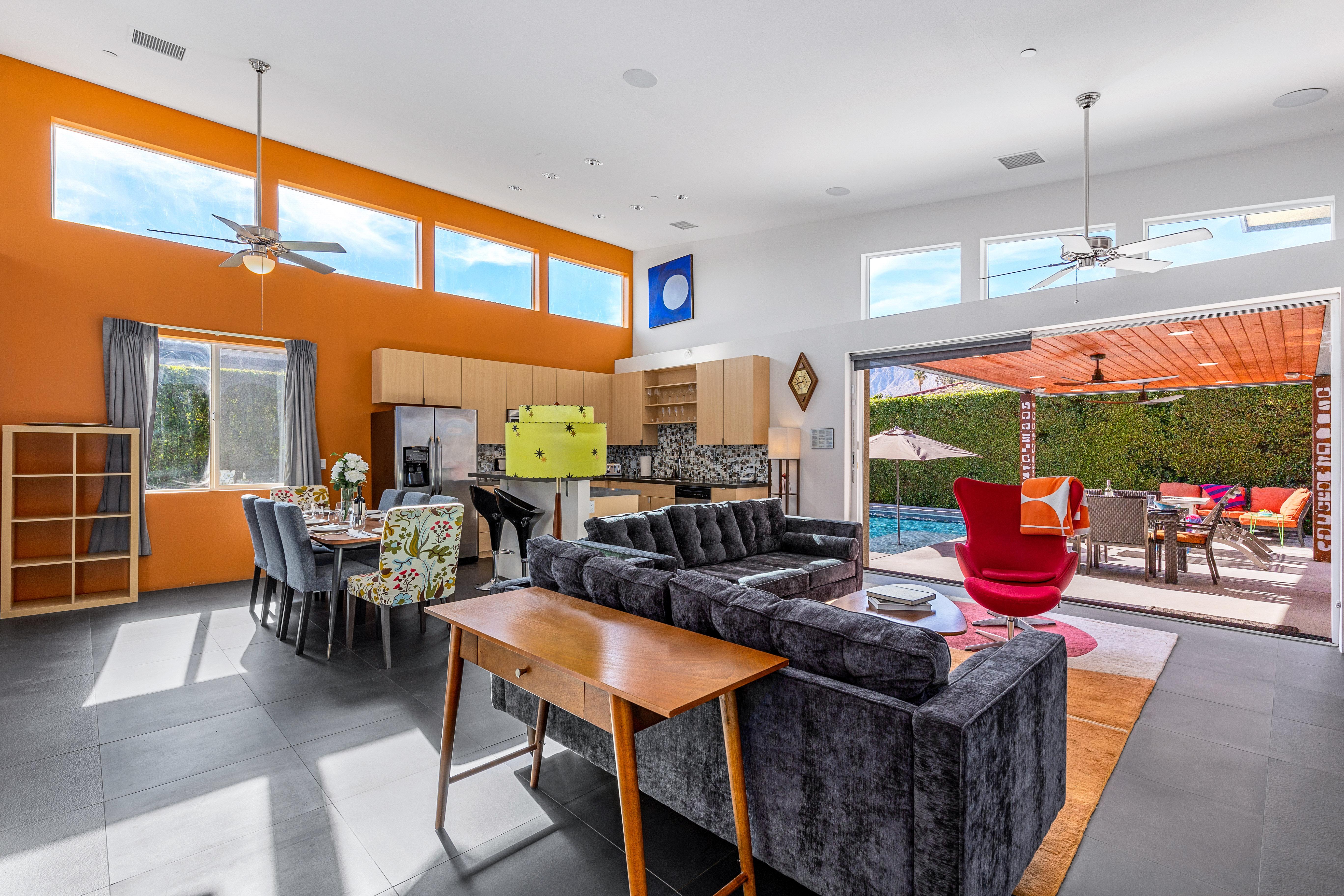 From the minute you enter the bright orange door, you’ll be swept away by the vibrant, colorful design and spacious open floor plan in this gorgeous home away from home. High ceilings and tons of natural light make the living area light and bright. Comfortable furniture is accented with mid-century modern decor and bright pops of color in the living area, dining area, and kitchen, which are all in one large open space, making it perfect for entertaining. Interesting sight lines give the impression of even more space. You can look all the way through the home from the back bedroom to the dining area, and at night, enjoy the dramatic sight of the full moon perfectly pictured in the clearstory windows. The well-appointed kitchen has plenty of counter space, cabinets, and everything else you need to make a memorable meal to enjoy at the 8-person dining table, kitchen island, or outdoor dining table.
