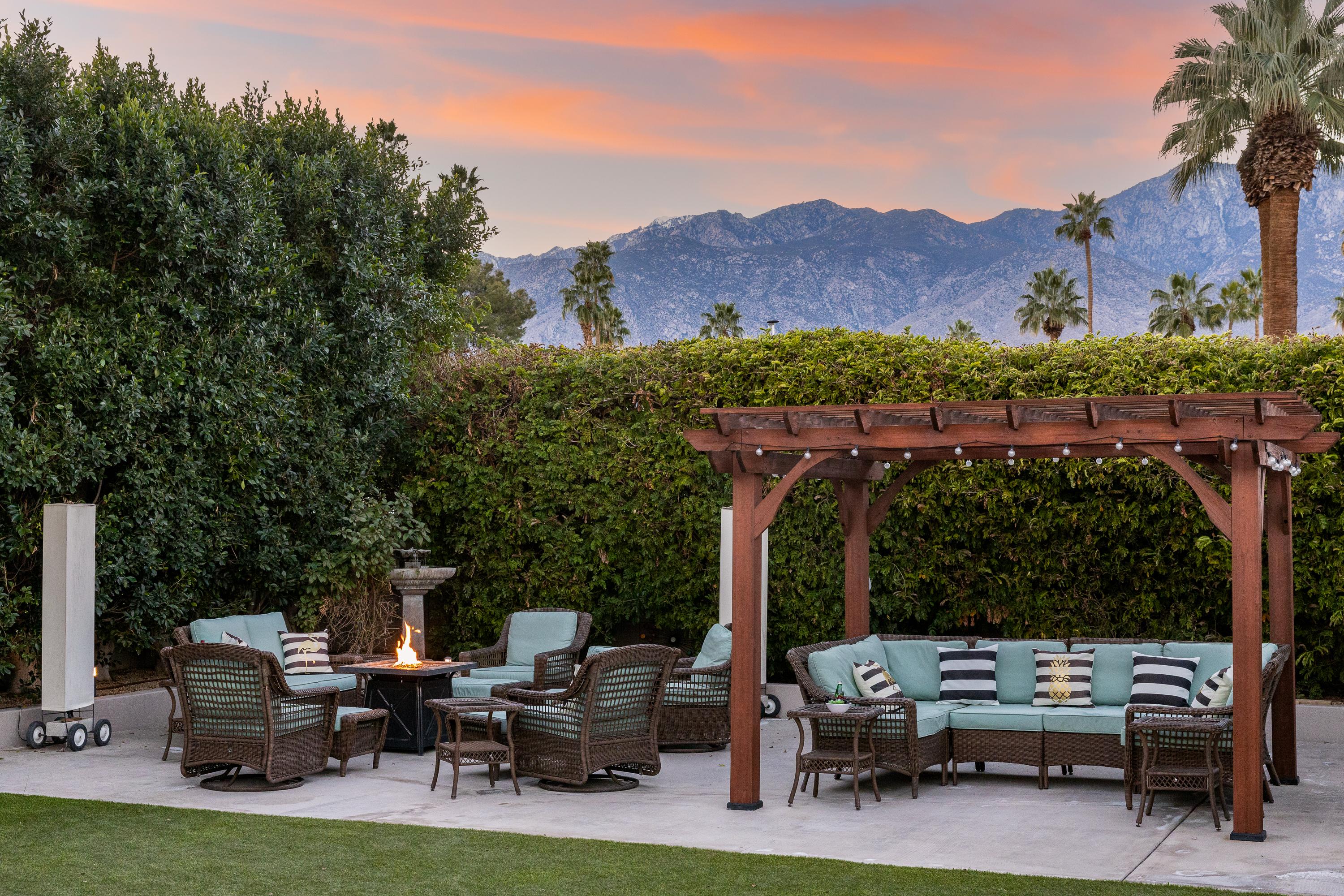 The private backyard captures the magic of Palm Springs living with panoramic views, resort-style amenities, and plenty of room to relax and play. On one side, a shimmering saltwater pool with waterfall spa invites sun-drenched afternoons on chaise lounges or the cabana-style daybed. On the other, a shaded pavilion offers alfresco dining, a cozy fire pit lounge, and space for sunset cocktails under glowing desert skies.