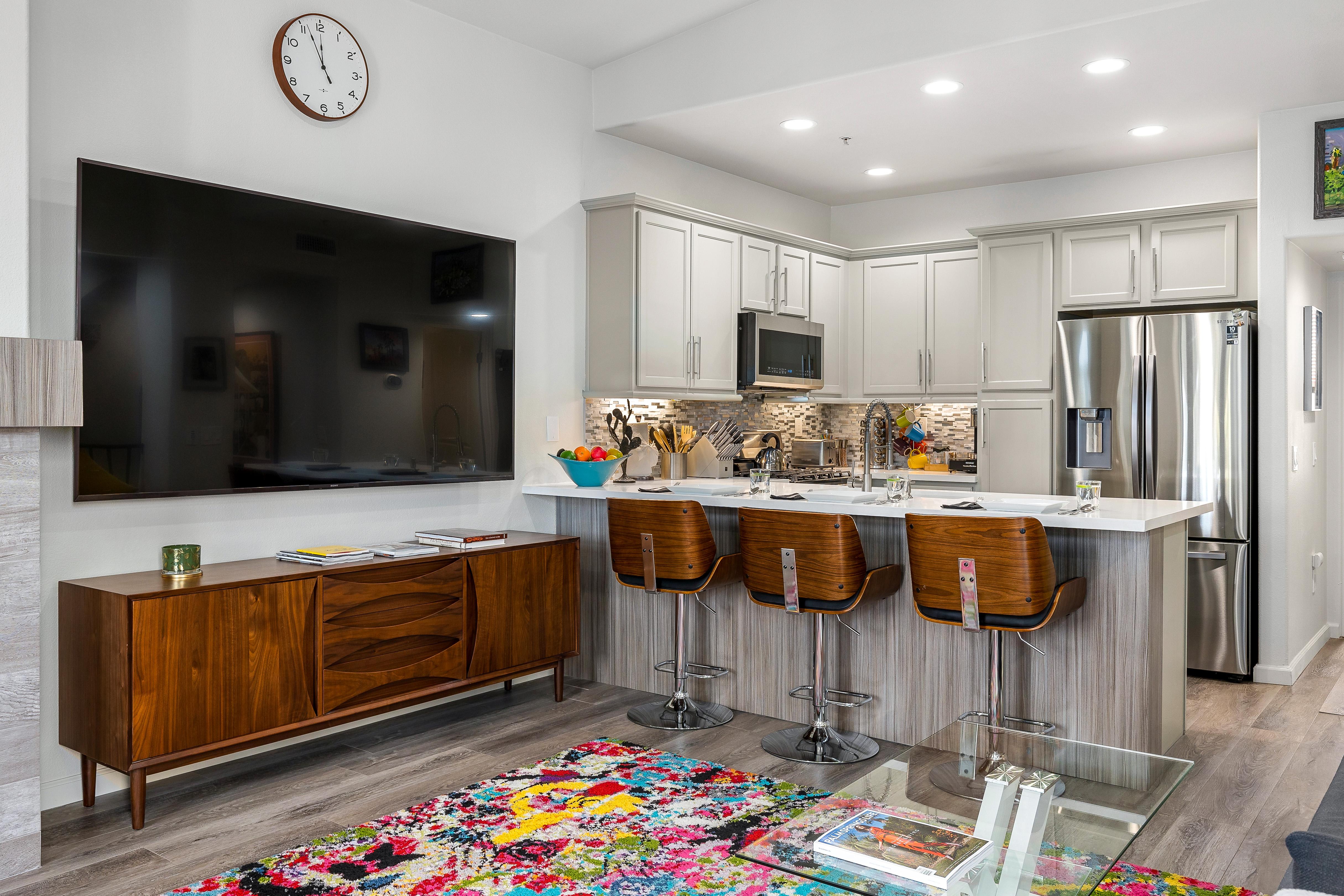 As you walk up the stairs to the main level living area, the lively modern décor will immediately catch your attention. The living room offers a luxurious place to relax while you sit back on the couch or in one of the accent chairs to watch a movie on the smart TV. Or dim the lights as you mix a cocktail of choice at the mini bar, with the gas fireplace on to set the mood.