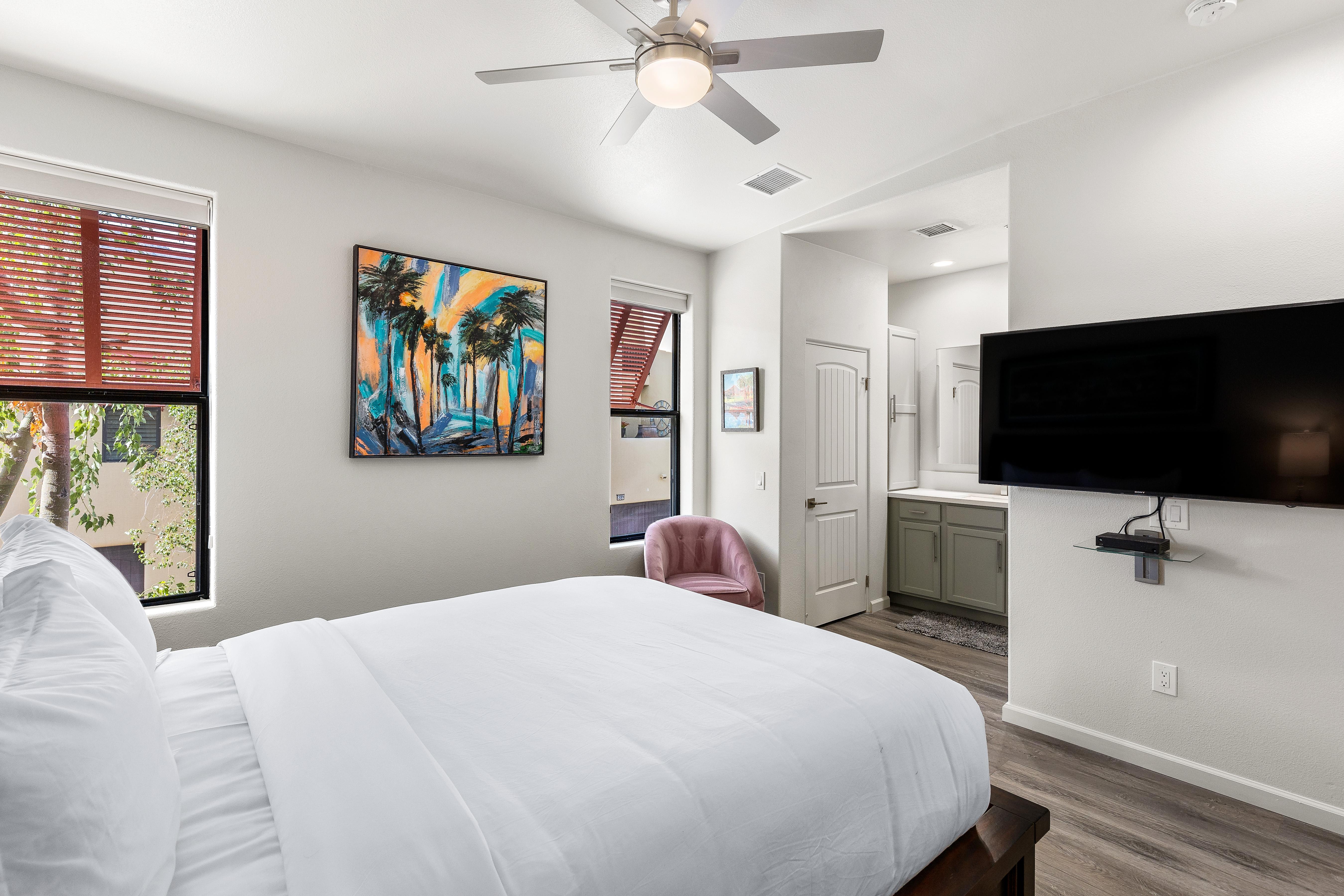 The classic Palm Springs decor oozes into the design of each hotel-style suite. Each of the bedrooms features a delightful Queen size bed as the centerpiece of the room, complete with luxurious linens paired with pillows that are guaranteed to help you drift off to sleep. Turn on the smart TV with a movie or show to help you doze off, or curl up in the retro accent chair to read a few pages prior to going to bed. The nightstands feature a charging port with several outlets available for all of your electronic needs. In the first-floor suite, open your blinds and have direct access to the patio to get a little sunshine to help wake you up.