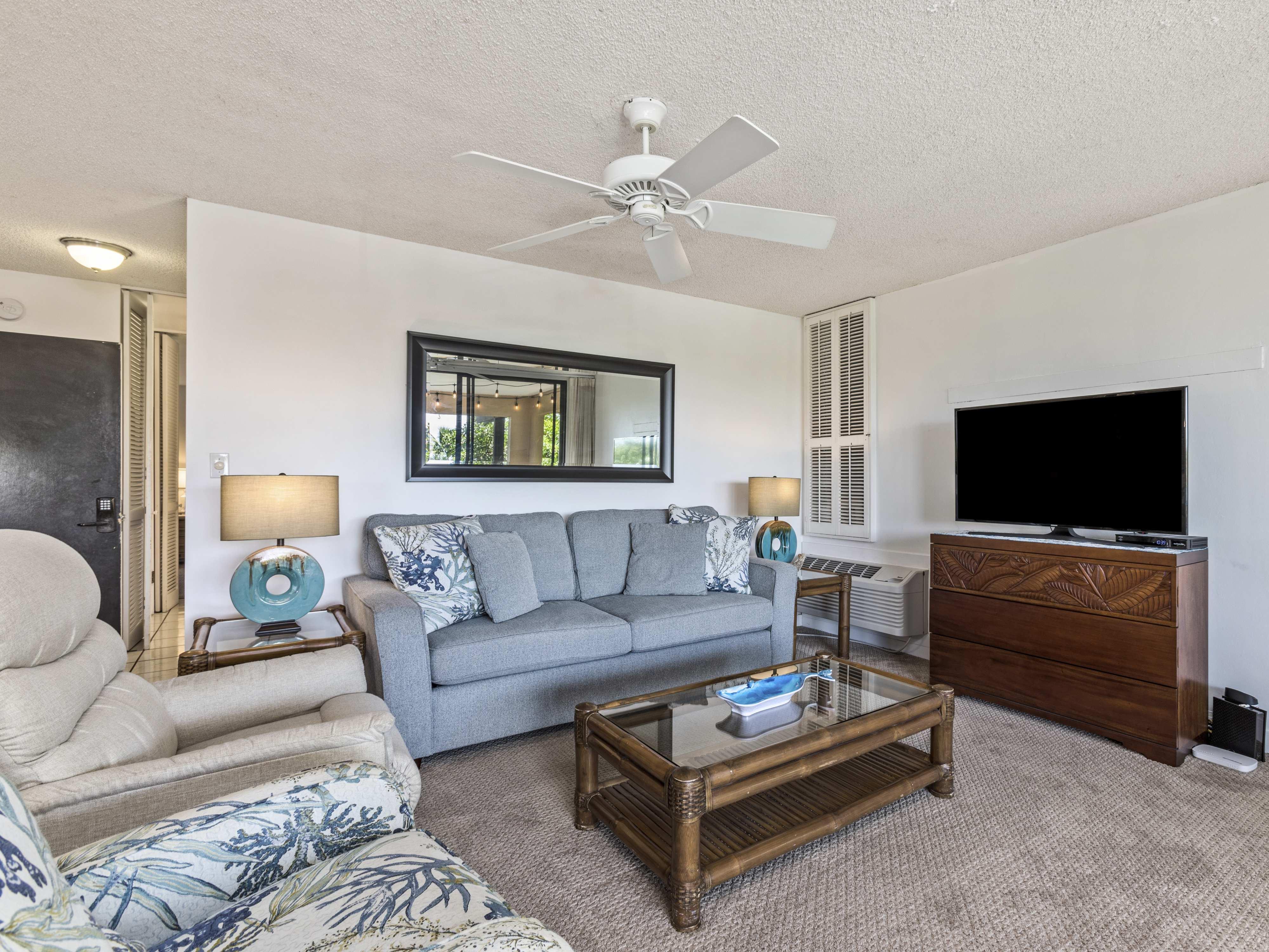 Welcome to the serene and luxurious Wailea Ekahi Village 11A, your perfect retreat nestled in the heart of Wailea. This beautifully designed 1-bedroom, 1-bathroom condo offers a tranquil escape for up to four guests. Step into a spacious, open-concept living area where you can unwind on the plush sofa bed, perfect for cozy nights in. The sleek, modern kitchen is fully equipped with all the essentials, including a refrigerator, oven, microwave, and dishwasher, making meal prep a breeze.