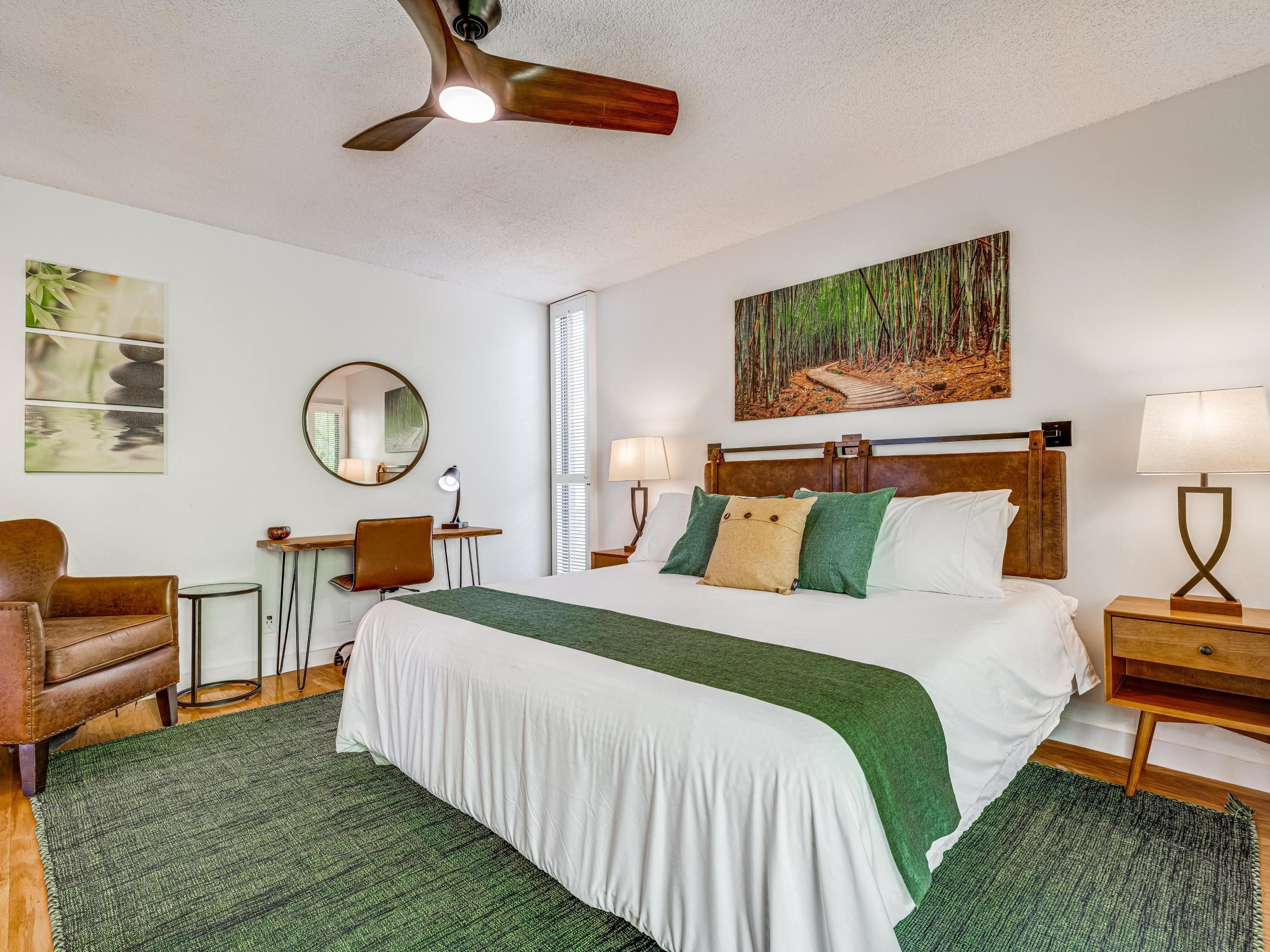 The master bedroom features a plush king-sized bed, ensuring a restful night's sleep. The full bathroom is elegantly designed with all the amenities you need, including a hairdryer and complimentary toiletries.