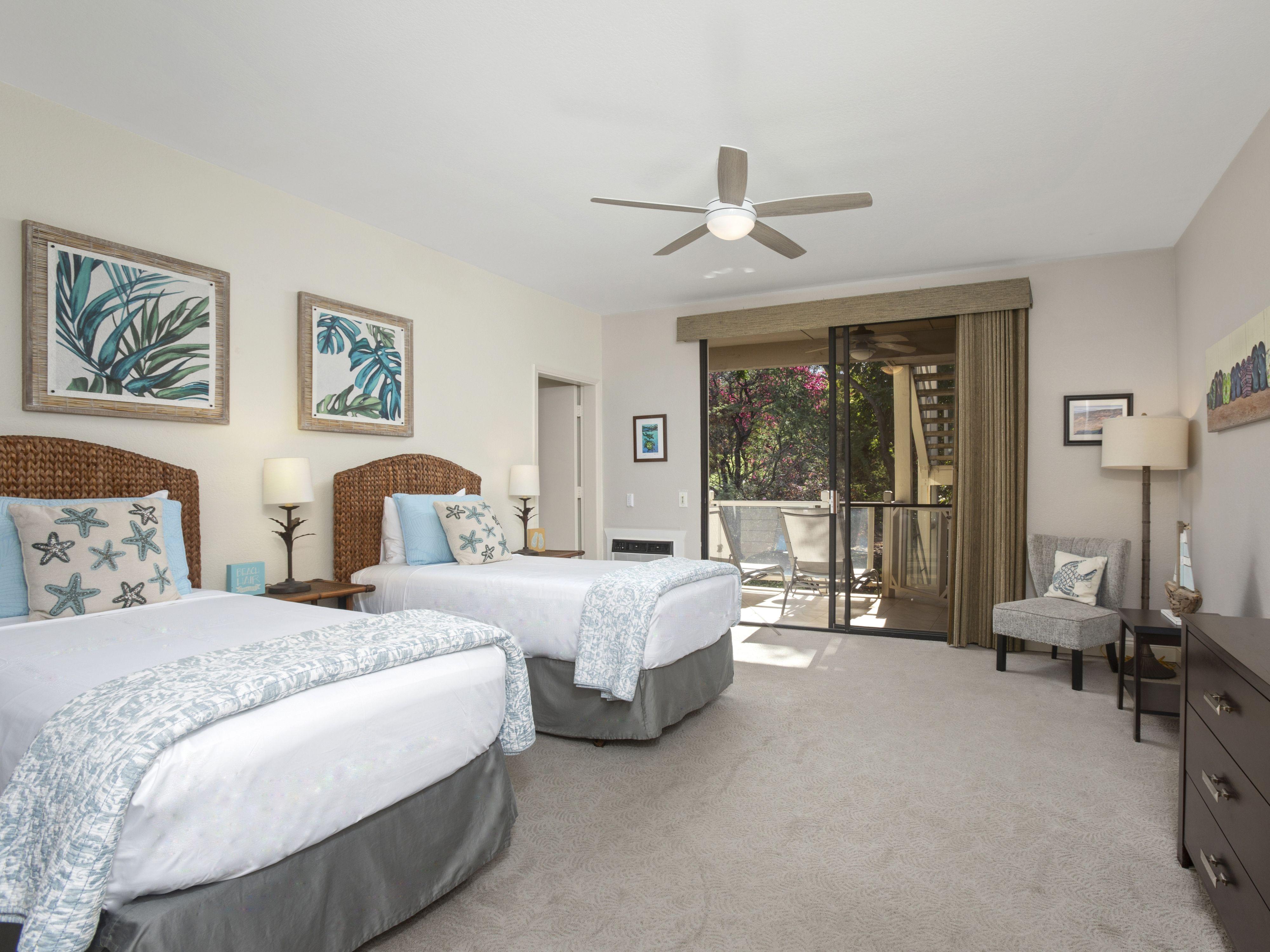 The master bedroom boasts a plush king bed, offering a tranquil retreat at the end of the day. The second bedroom features two twin beds, making it ideal for families or friends traveling together. Both bedrooms are complemented by two full bathrooms, ensuring convenience and privacy.