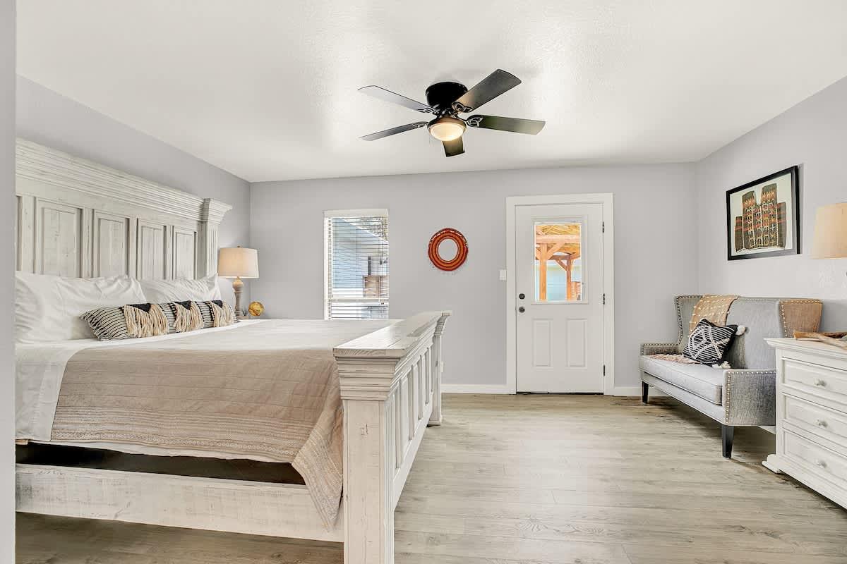 Welcome to the Wanderlust #1! This gorgeous four-plex home is a Fredericksburg luxury destination that has been decorated with an eclectic mix of photography and artifacts from Africa and Central Asia. This beautiful home is just a few minutes away from Main Street, making it the perfect location to enjoy the lively and historic downtown Fredericksburg! This modern home is located in a stunning property with a beautiful shared outdoor courtyard.