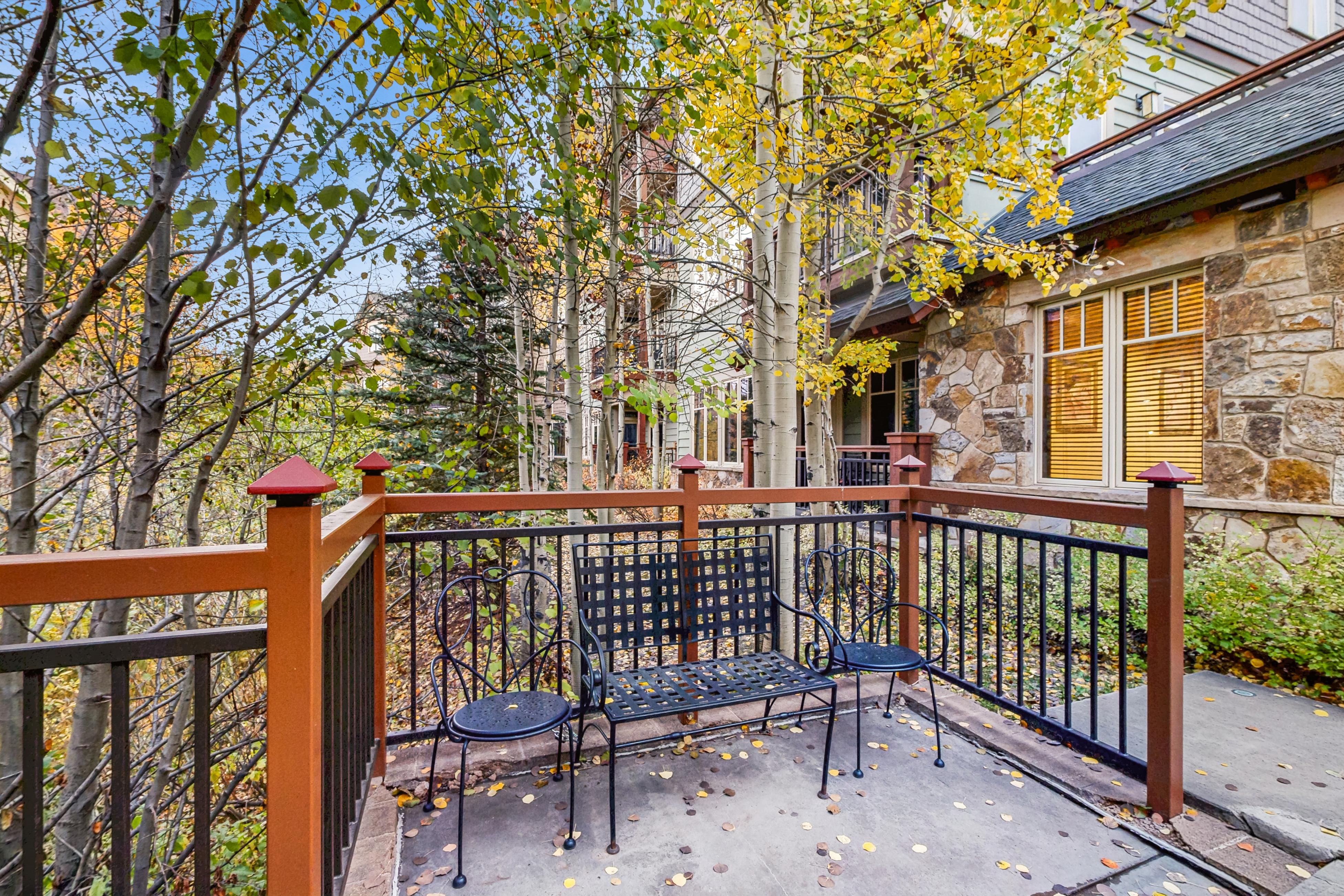 The living area is open, spacious, and elegant, with vaulted ceilings, glossy wood floors, a handsome gas fireplace, and rustic-inspired decor. The kitchen is equipped with everything you might need, and there's mealtime seating at both the dining table and island breakfast bar. The private balcony is the perfect place to enjoy a morning coffee or an evening glass of wine while taking in the sweet mountain air.