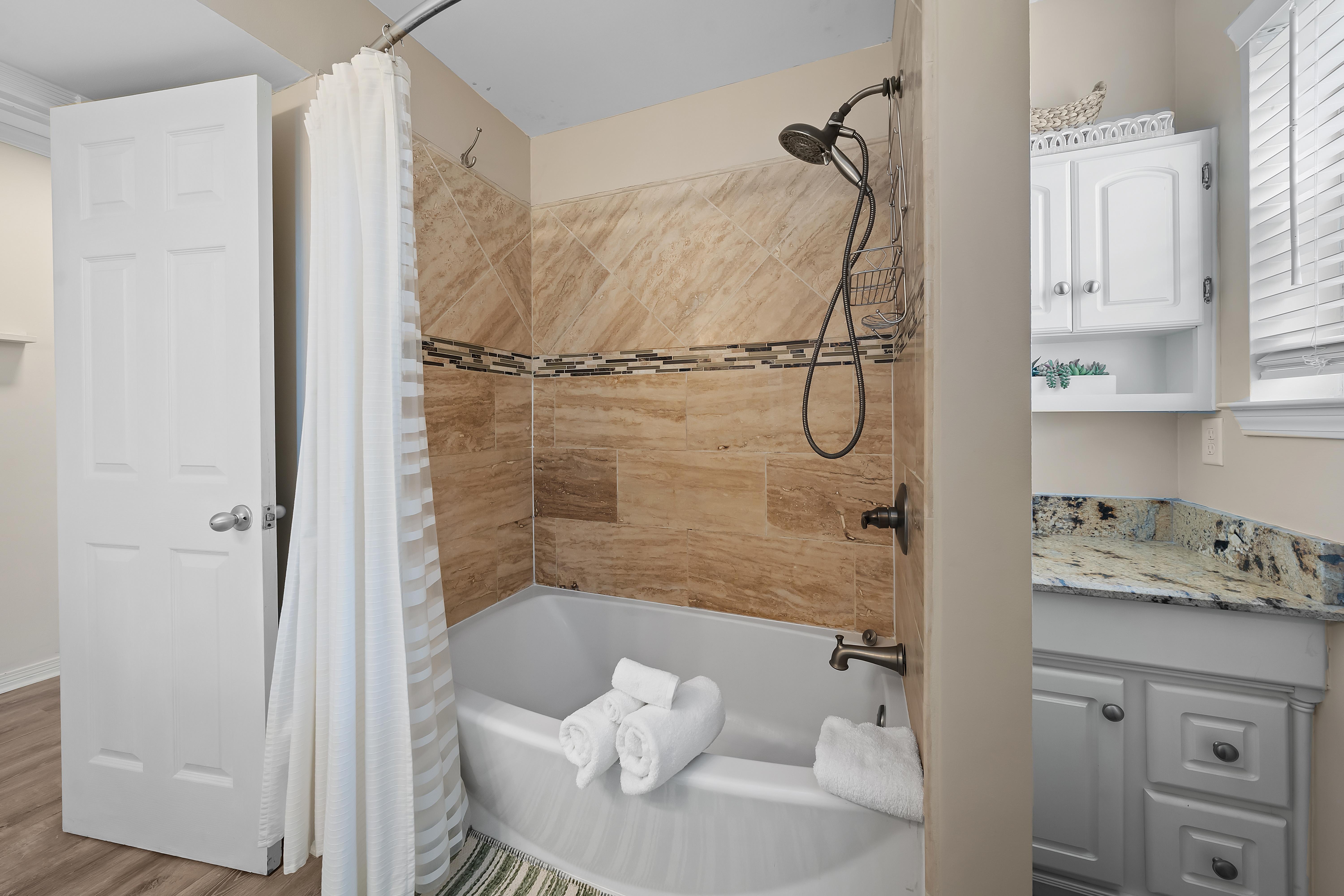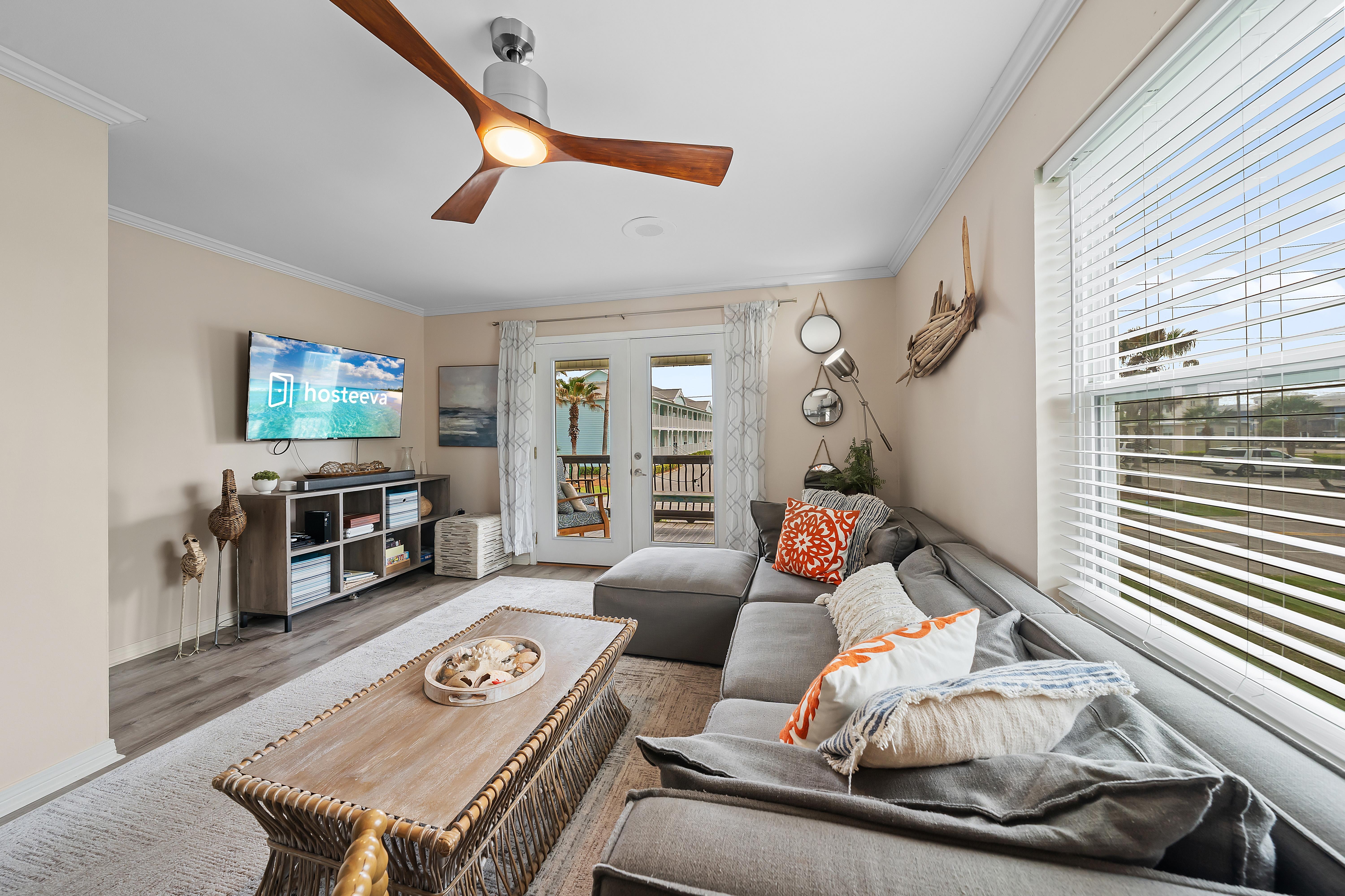 Beneath the house, there's deck patio with BBQ area. Additionally, there is outdoor shower to rinse off the sand after a day at the beach. If you're bringing jet skis, you can park them under the unit and easily launch them just around the corner.